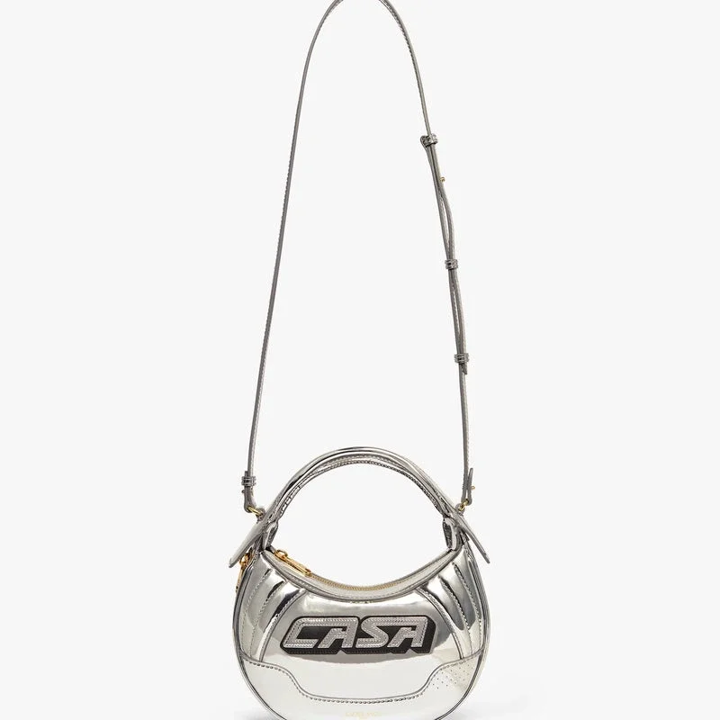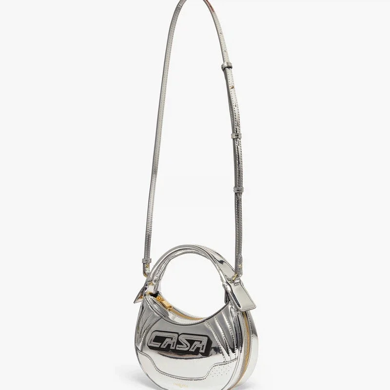El bolso Silver Biker está confeccionado en piel y presenta la inscripción «Casa» de la marca en la parte delantera. Se completa con una correa, cierre de cremallera, detalles de cremallera, herrajes chapados en oro y una silueta redondeada. Se suministra con una caja de regalo, una bolsa protectora con la marca y un folleto con los detalles del producto.