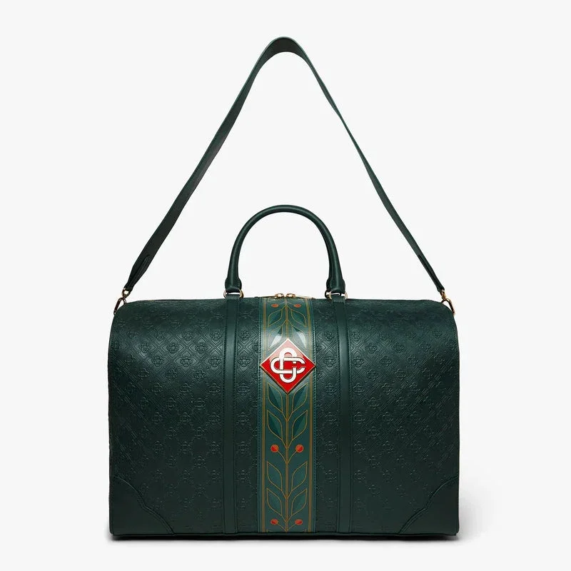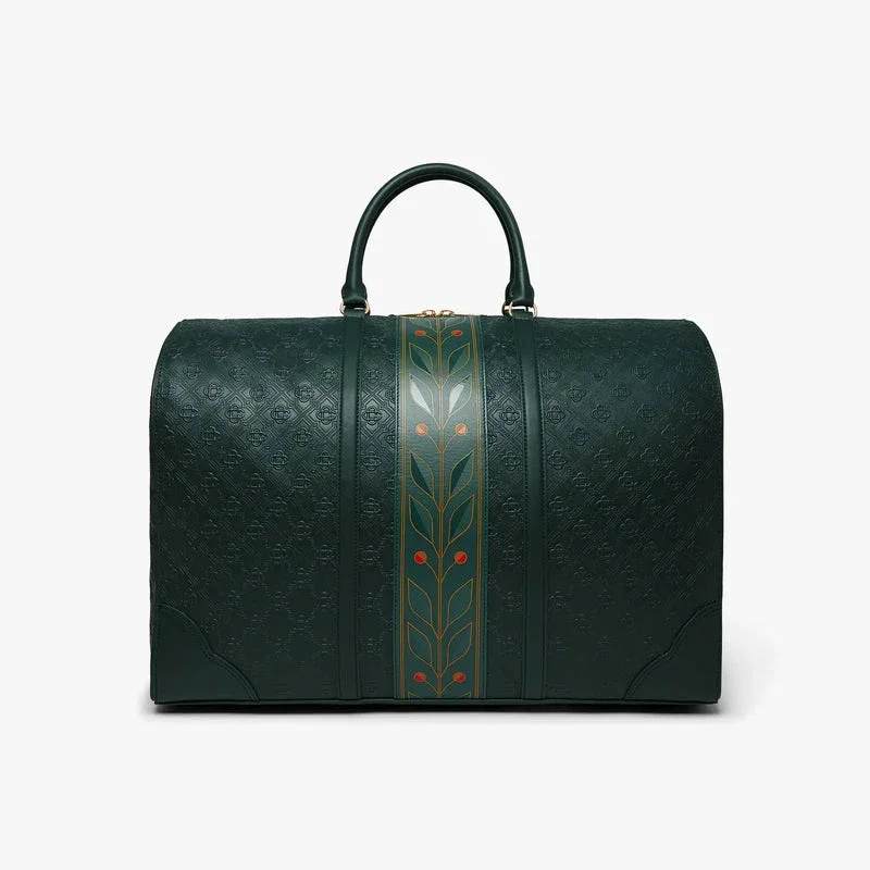 La bolsa de fin de semana Monogram verde está confeccionada en piel italiana y adornada con el emblemático logotipo de diamantes de la casa en el lateral. Se completa con el emblemático motivo de laurel de la casa, asas, cierre de cremallera, correa para el hombro, un bolsillo interior y herrajes de latón. Se suministra con una caja de regalo con la marca Casablanca, una bolsa protectora y un folleto con los detalles del producto.