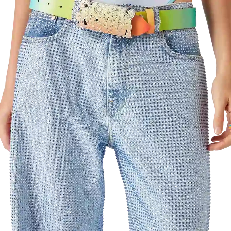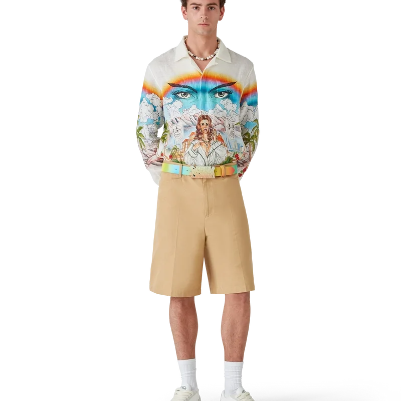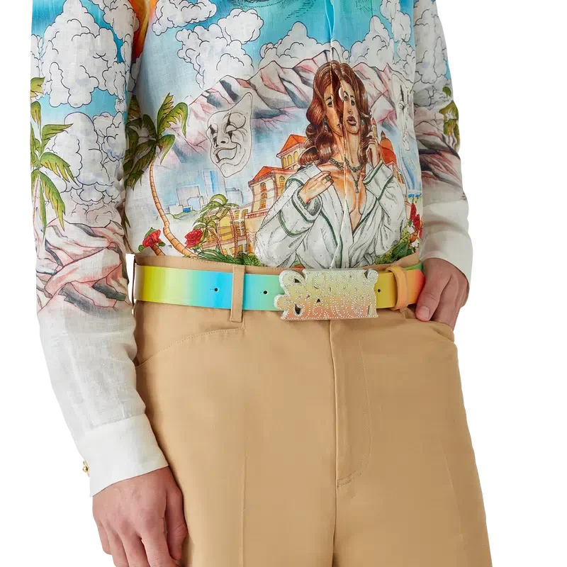 El cinturón La Musique presenta un diseño multicolor degradado con un estampado psicodélico inspirado en los años 70 y colores vibrantes que rinden homenaje a la legendaria contribución de Bootsy Collins a la escena musical funk. Confeccionado en piel de becerro y rematado con una hebilla de latón pintada que luce el logotipo apilado de Casablanca con tipografía inspirada en los años 70.