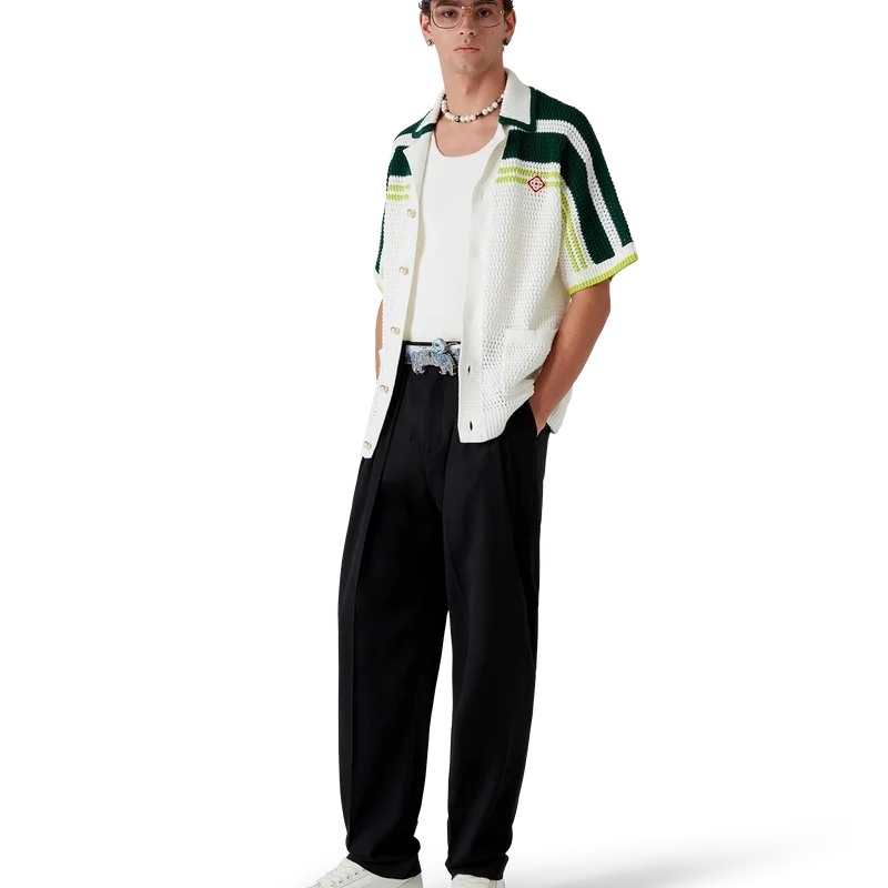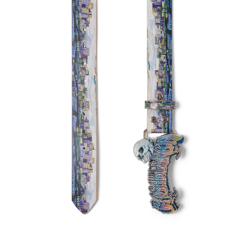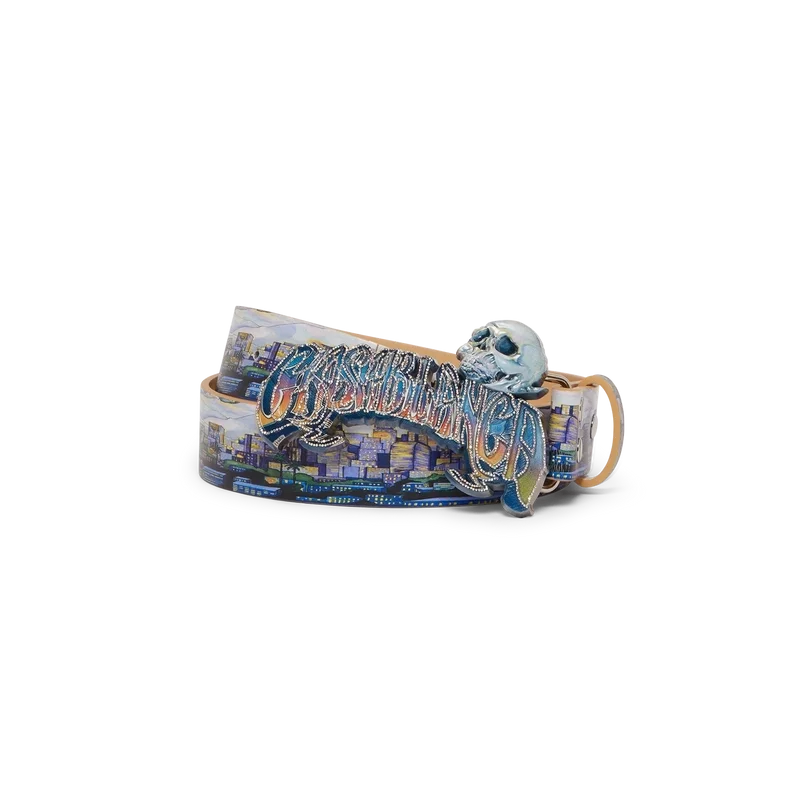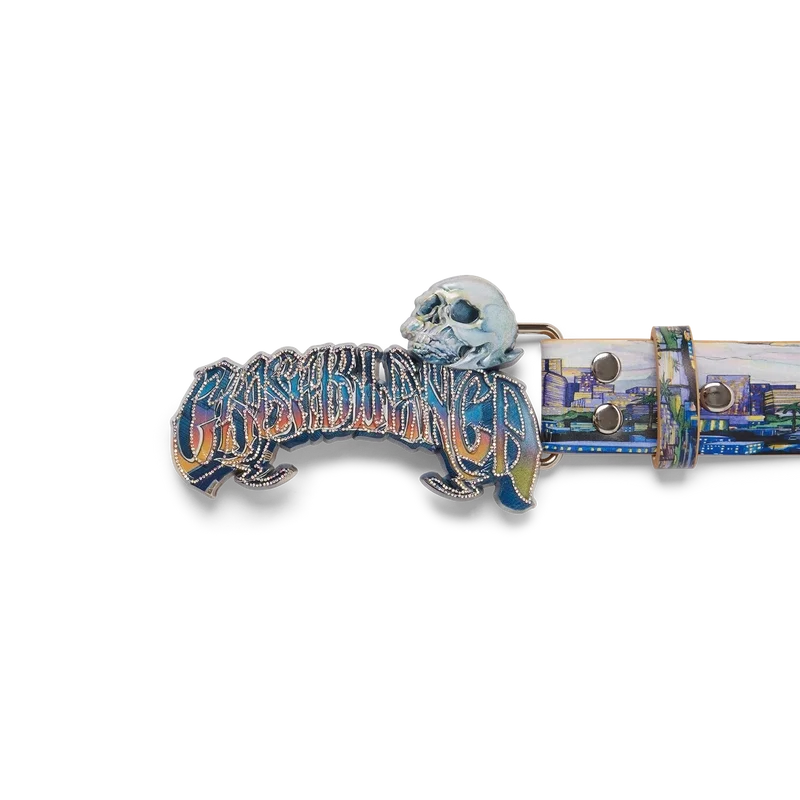 El cinturón La Premonition presenta un diseño con el motivo de temporada de la casa, inspirado en una inquietante visión del horizonte de La de noche, con elementos de ovnis que evocan la ciencia ficción vintage, confeccionado en piel de becerro. Se completa con una hebilla de latón pintada que presenta la tipografía del logotipo de Casablanca dibujada a mano, inspirada en la tipografía gótica utilizada en los tatuajes, en el degradado de la temporada, y una calavera.