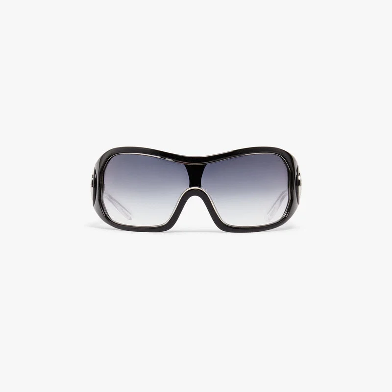 Las gafas de sol Black Outline Shield están fabricadas en acetato y metal con una montura envolvente, y presentan una silueta arquitectónica elegante. Las lentes con degradado gris ofrecen una protección UV del 100 % y el diseño se completa con el logotipo CC entrelazado en tono plateado de la casa en las patillas, lo que le da un toque final refinado.