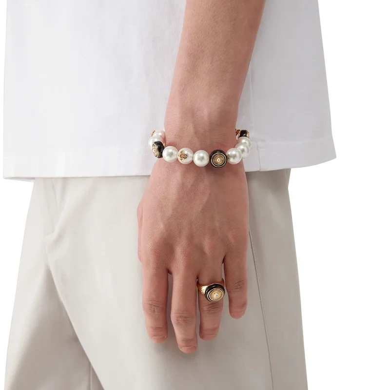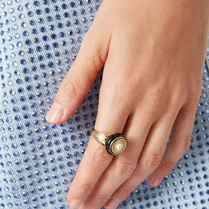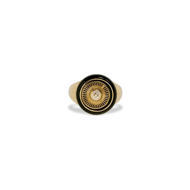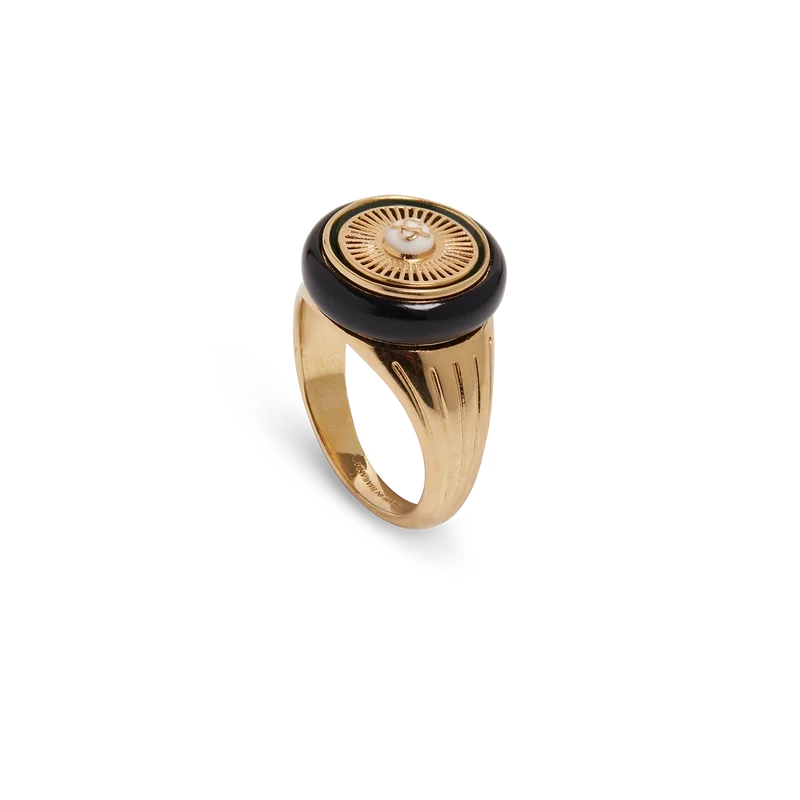 El anillo Spoke Wheel está elaborado en latón chapado en oro y esmalte. Se completa con el logotipo de las dos C entrelazadas de la casa en el centro de la cara con diseño de rueda y líneas grabadas en los laterales.