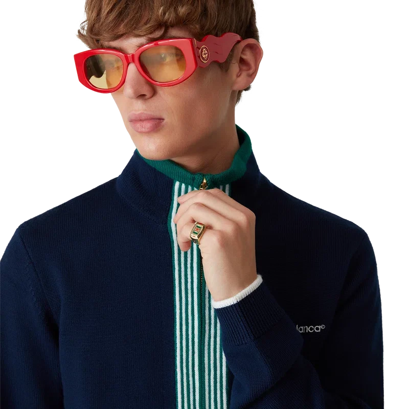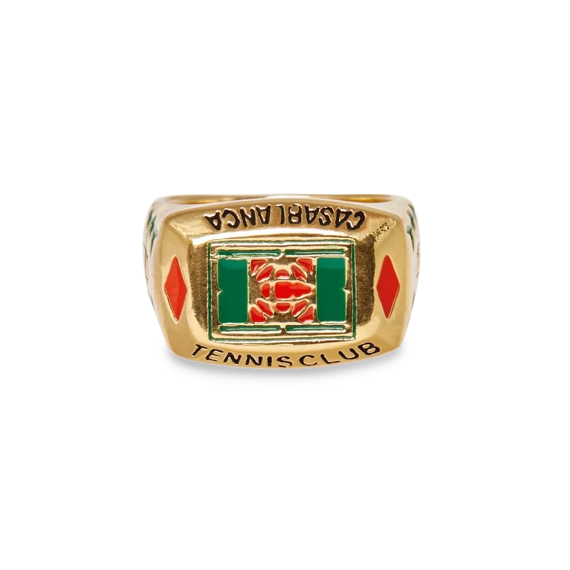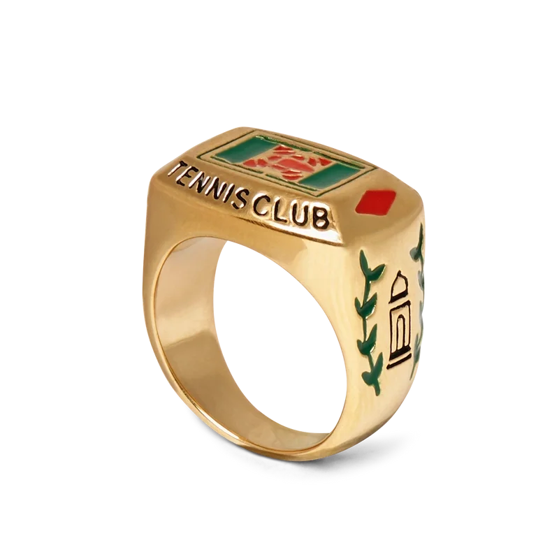 El anillo Tennis Club está elaborado en latón chapado en oro y esmalte pintado a mano. Con detalles de follaje y el logotipo del Casablanca Tennis Club, esta pieza viene con una caja de regalo, una bolsa protectora y un folleto con los detalles del producto.