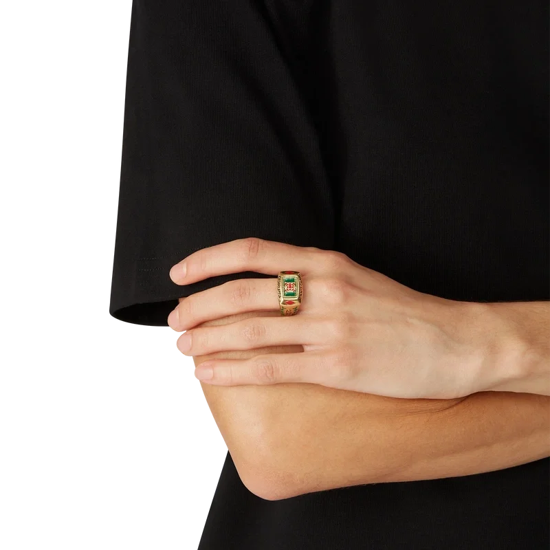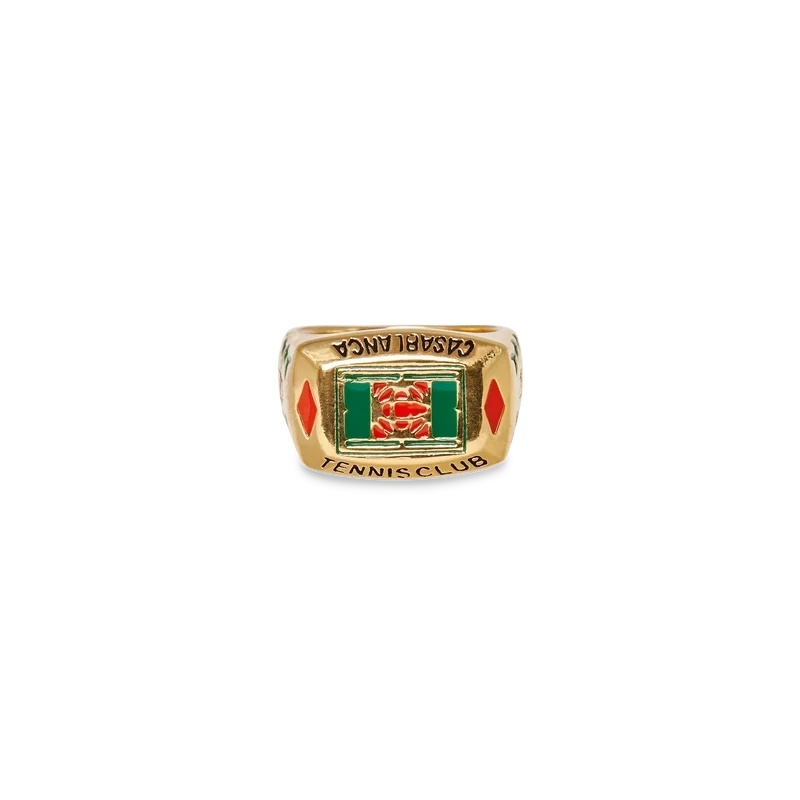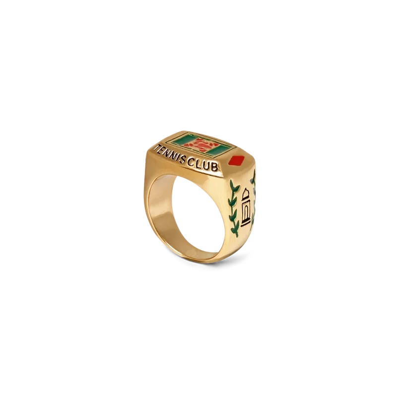 El anillo Tennis Club es una pieza de nuestra colección principal basada en la identidad de la casa, elaborada en latón chapado en oro y esmalte pintado a mano. Acabado con detalles de follaje y el logotipo del Casablanca Tennis Club. Esta pieza viene con una caja de regalo, una bolsa protectora con la marca y un folleto con los detalles del producto.