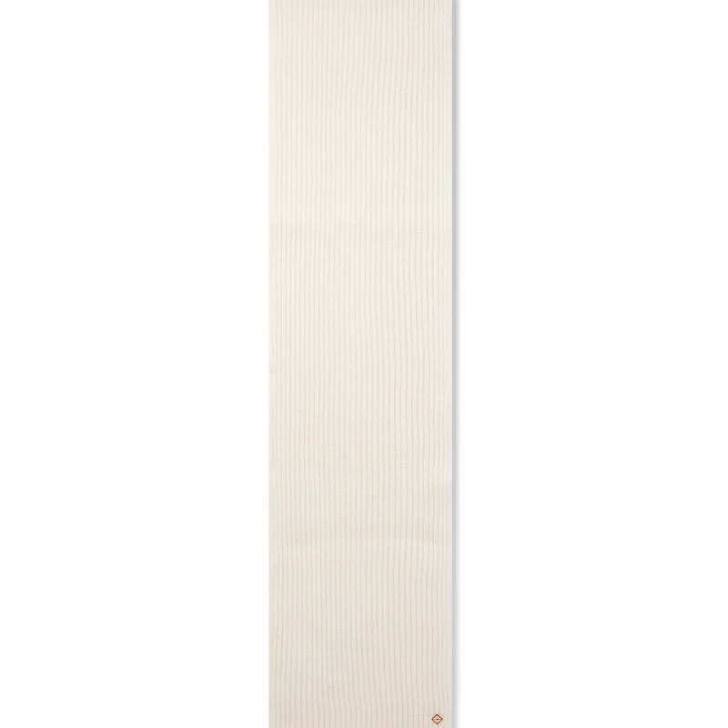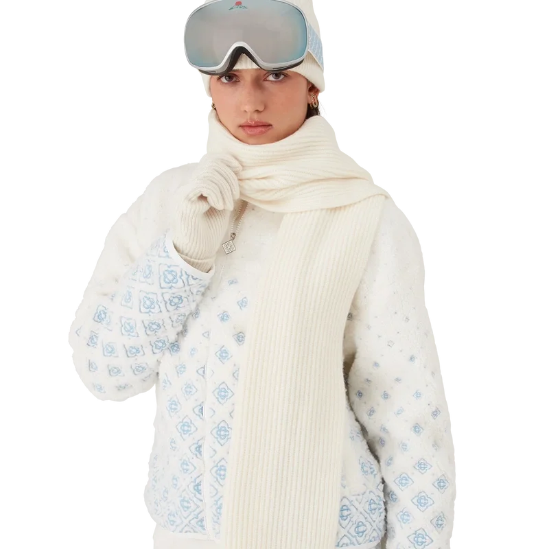 La bufanda de esquí presenta un diseño refinado confeccionado en punto elástico de lana en color blanco, inspirado en la nieve virgen que cubre los pueblos rurales de Hokkaido, en Japón. Evocando bosques de bambú cubiertos de escarcha y granjas enclavadas en valles alpinos, el diseño encarna los códigos Apras-Sport de la casa con una confección precisa.