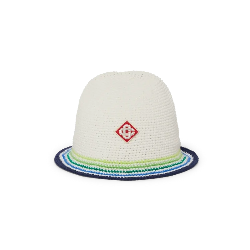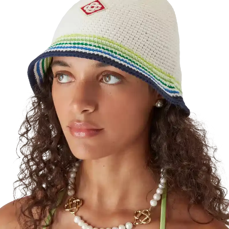 La gorra Beach Club es un refinado modelo tipo cubo confeccionado en algodón de ganchillo con el emblemático logotipo de diamantes de la casa en el centro. Rematada con una visera a rayas azules, verdes, amarillas y blancas.