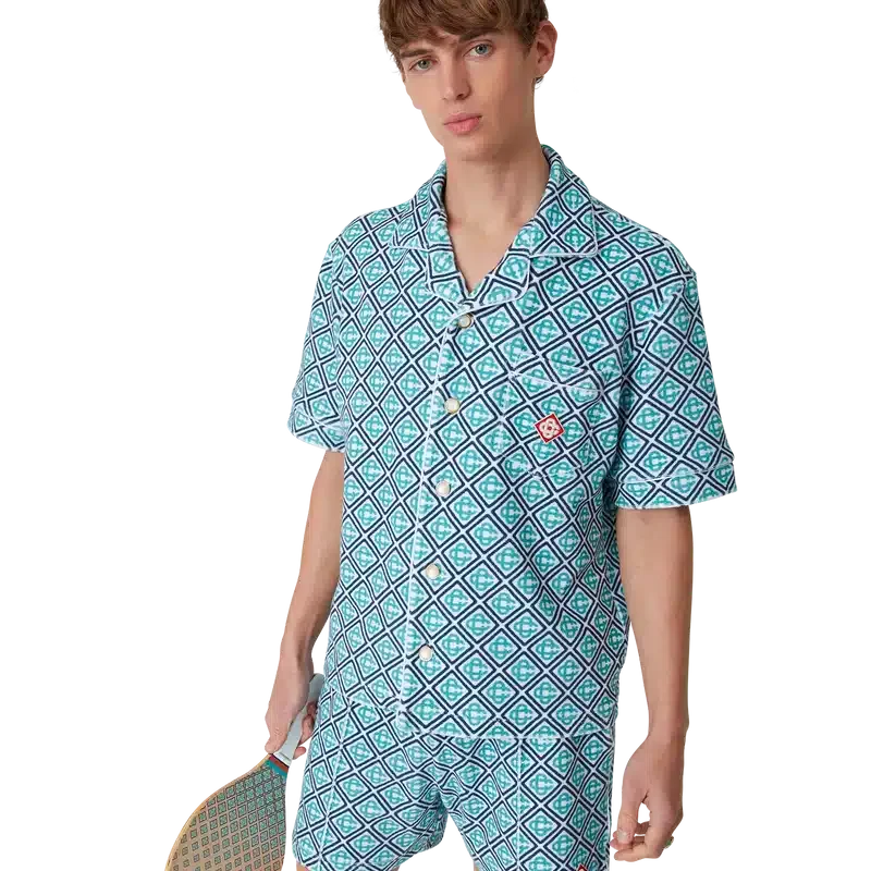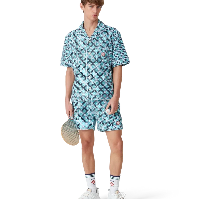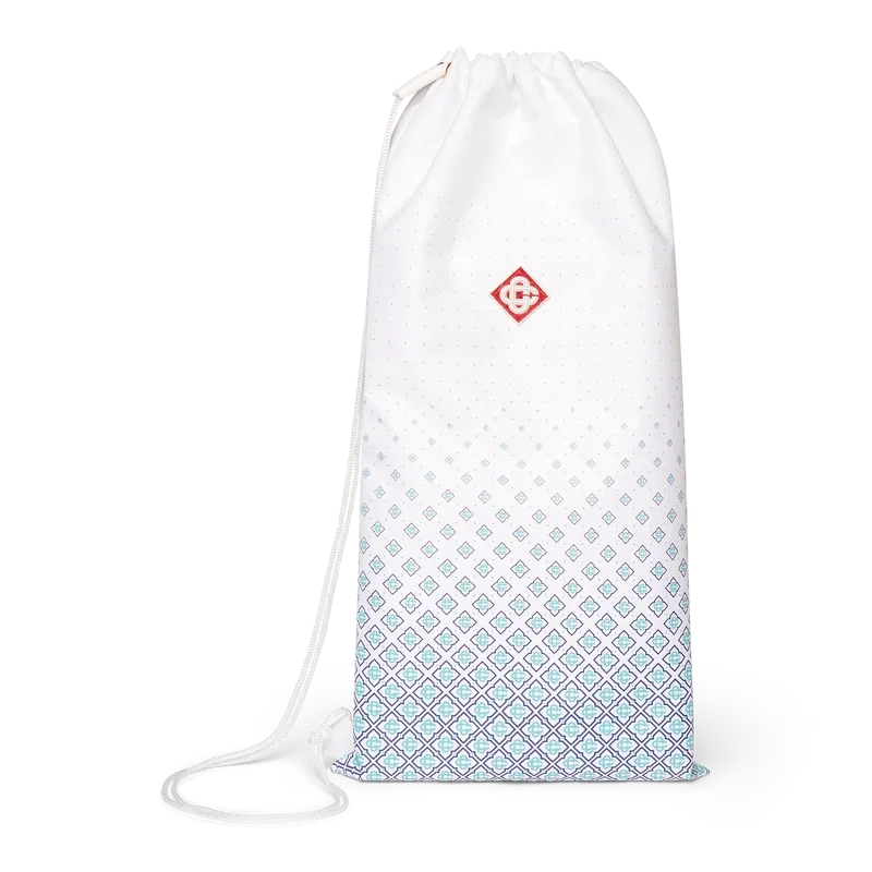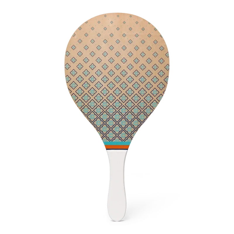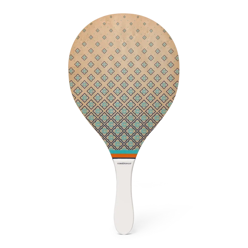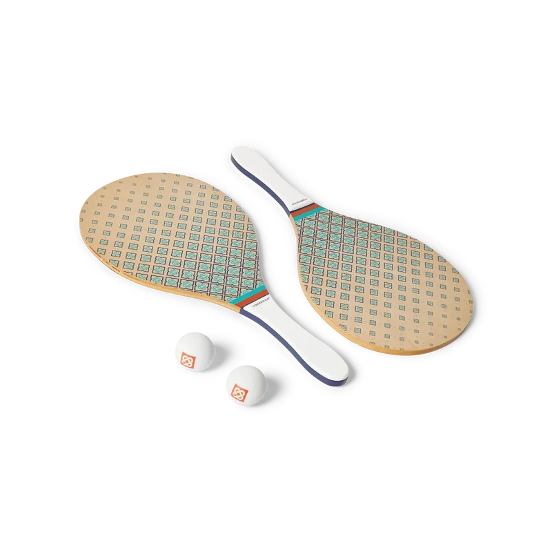 Los bates y pelotas de playa están fabricados en madera contrachapada y pintura al óleo, y presentan el estampado monograma degradado de la casa en las caras. Se completan con detalles de pintura a rayas en tonos menta, naranja y azul marino en el cuello, un mango blanco y dos pelotas de goma con el logotipo de la marca. Mide 19,2 cm (de ancho) x 39 cm (desde el borde superior de la cara hasta la parte inferior del mango) y viene con su propia bolsa de almacenamiento con el logotipo de la marca y una correa.