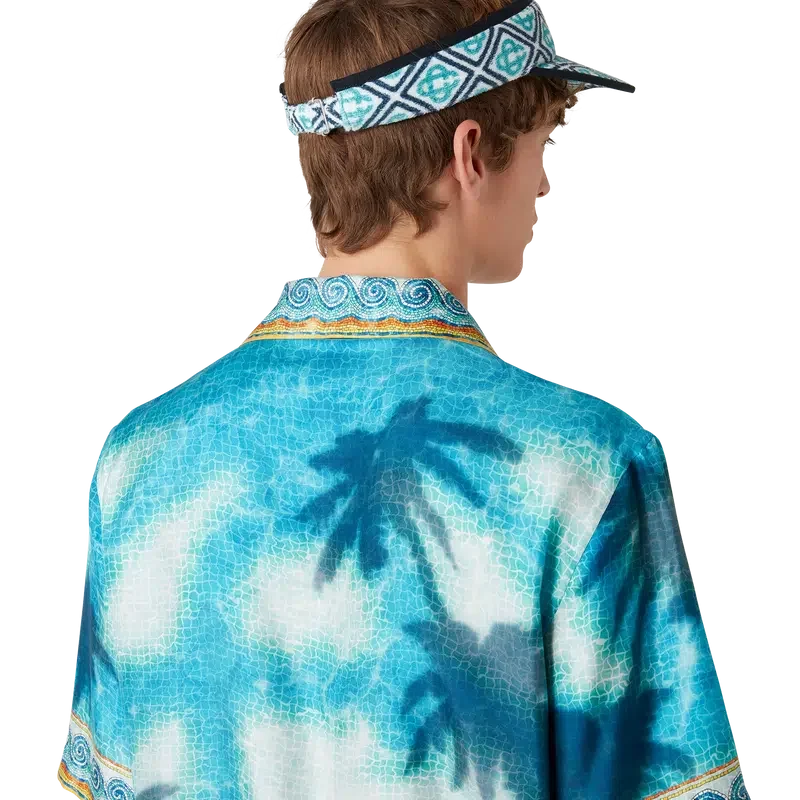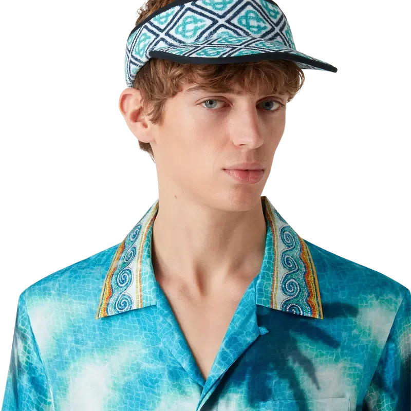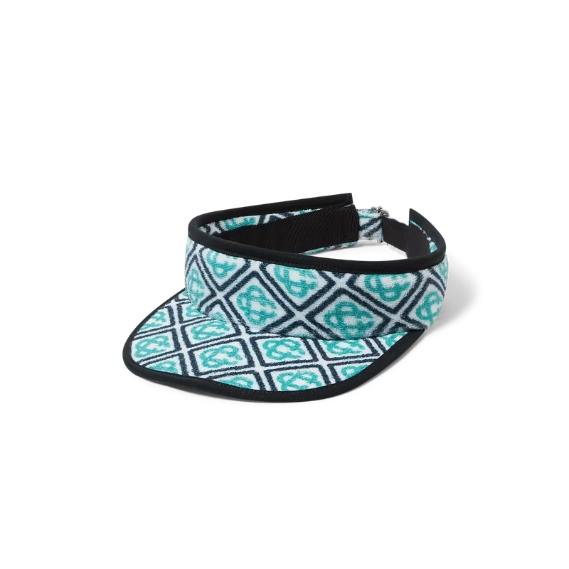 La visera de rizo con monograma es un diseño estampado confeccionado en tejido de mezcla de algodón. Cuenta con una visera, una hebilla ajustable y ribetes en azul marino.