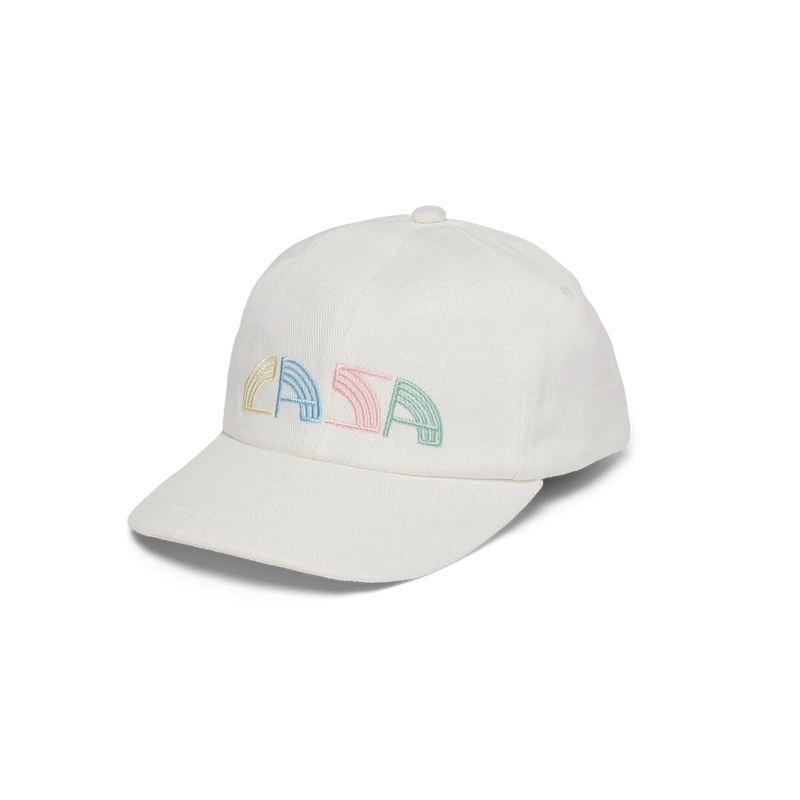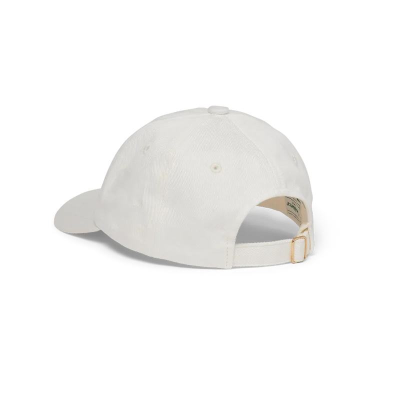 La gorra bordada Casa Deco en color blanco roto presenta el doble logotipo de la colaboración. Se completa con un cierre ajustable de velcro dorado en la parte trasera.