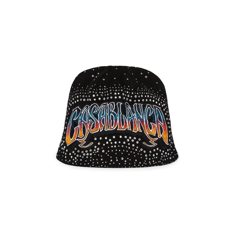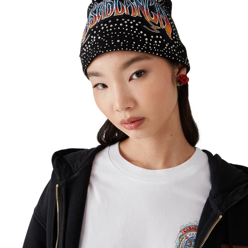 El gorro adornado con cristales góticos es un diseño tejido confeccionado en tejido de lana con detalles de abalorios de cristal. Se completa con el logotipo de Casablanca bordado a mano, inspirado en la tipografía gótica utilizada en los tatuajes.