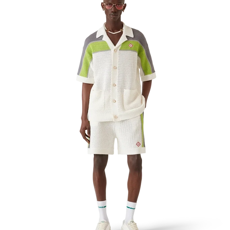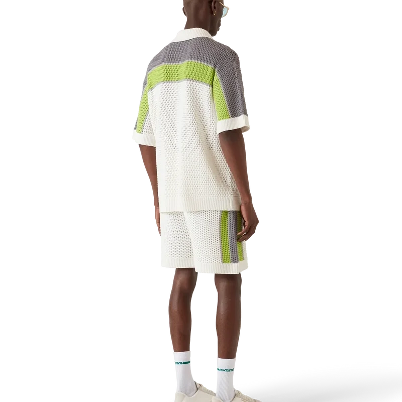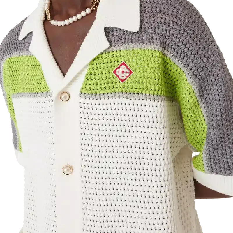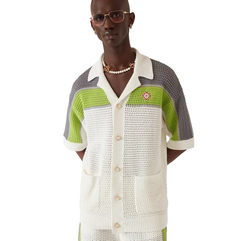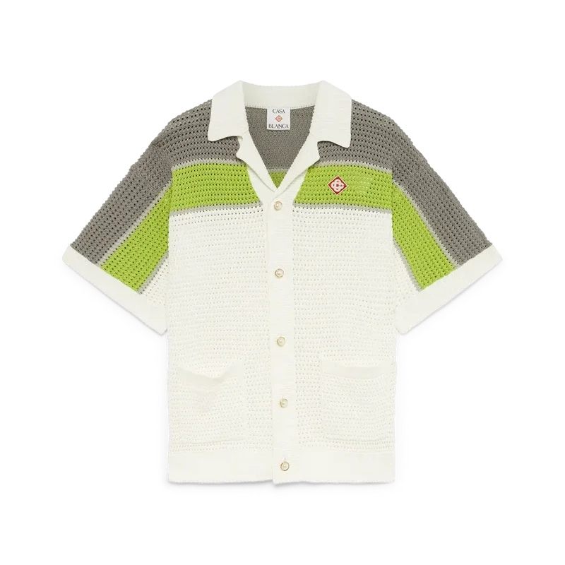 La camisa de ganchillo a rayas es un diseño clásico y refinado que presenta el logotipo de la casa y detalles de rayas en los hombros, el pecho y las mangas, en colores naturales. Acabada con cuello, puños y bajo acanalados, cierre frontal con botones, bolsillos de parche en la parte delantera, botones de perla con borde dorado característicos y una silueta holgada.