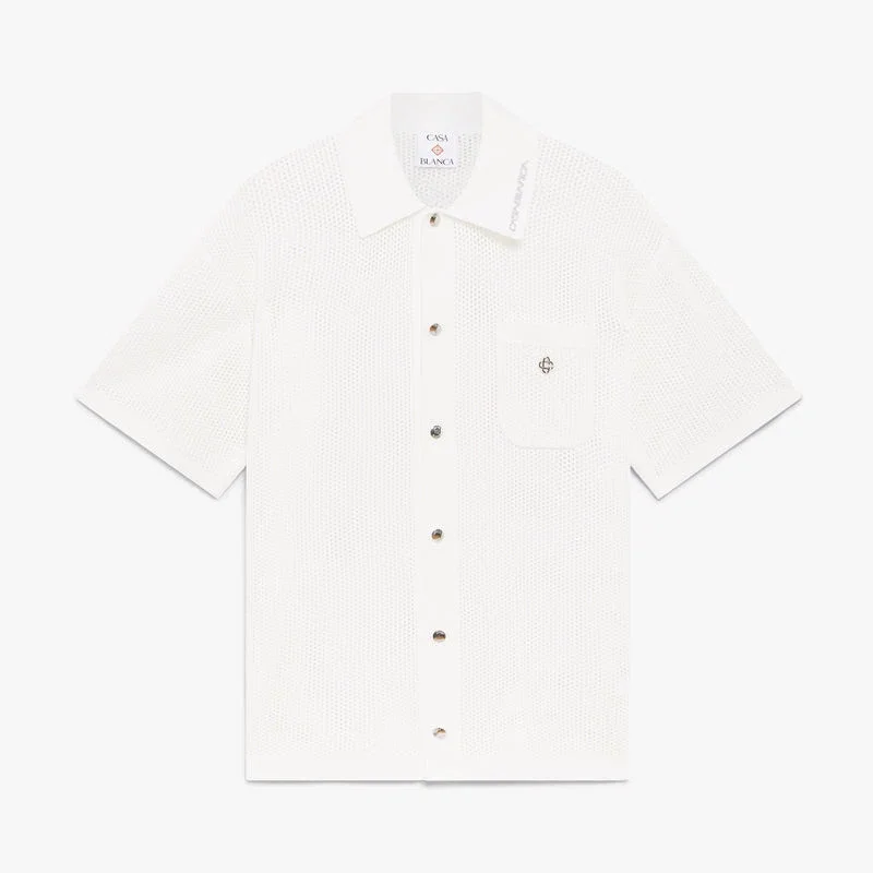 La camisa de malla blanca de manga corta presenta un diseño refinado que encarna el enfoque sofisticado de la casa en cuanto a la ropa informal. Cuenta con cuello, cierre de botones, botones de perla con borde dorado característicos y un bolsillo en el pecho con el logotipo de la casa.