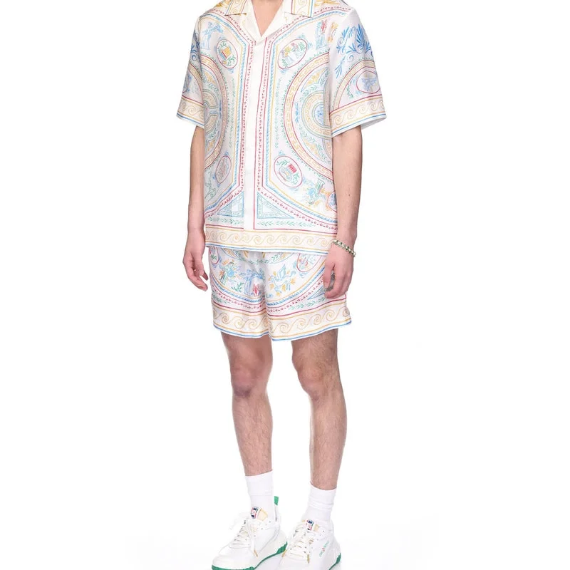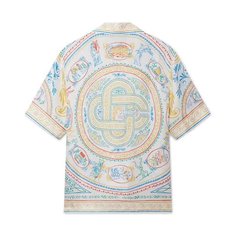 La camisa de seda Crayon Vase presenta un estampado multicolor confeccionado en sarga de seda, con un diseño de temporada inspirado en la disposición clásica de los platos griegos y los códigos de diseño de la casa. Se completa con cuello cubano, cierre de botones, botones de corozo con el logotipo CC característico y los detalles de la temporada: ondas griegas y bordes a rayas en el cuello, los puños y el dobladillo.