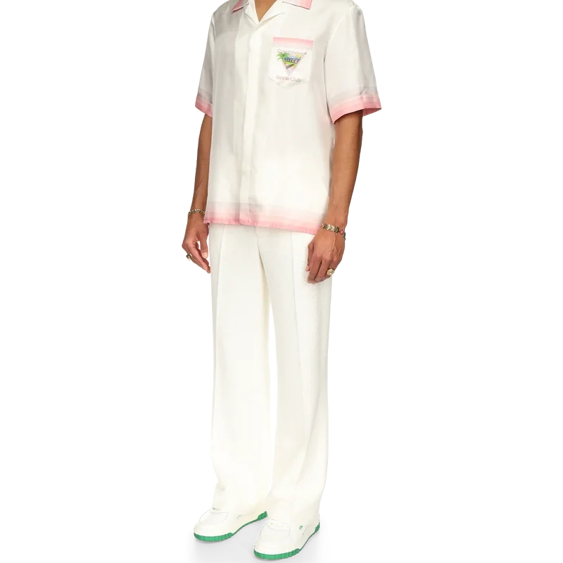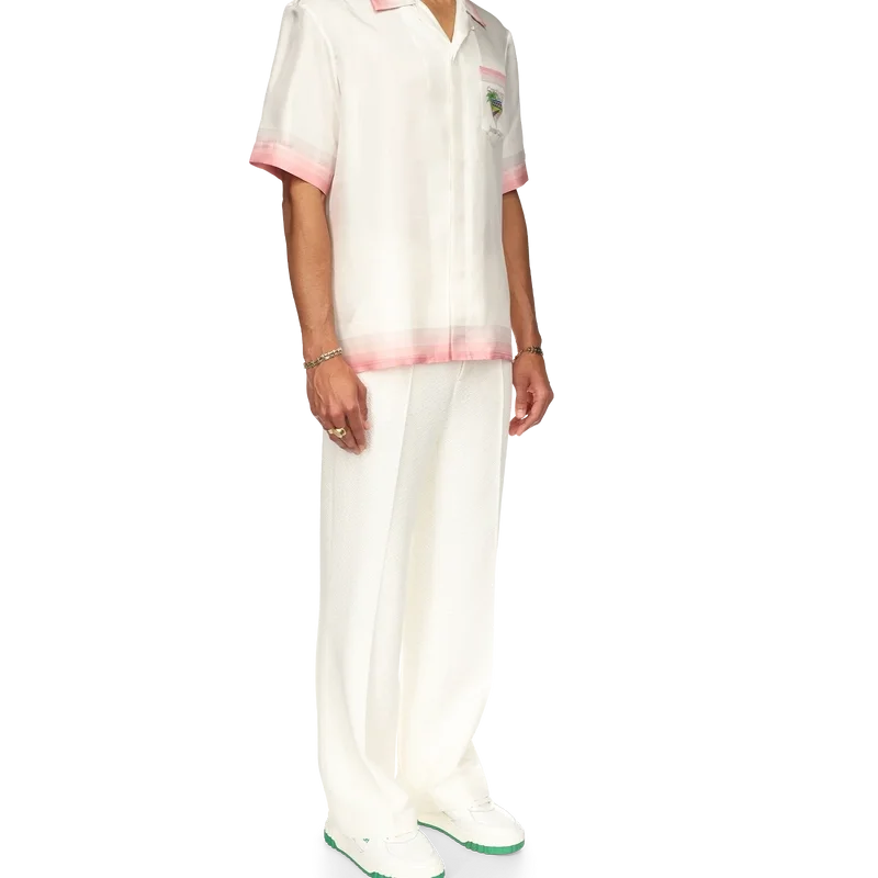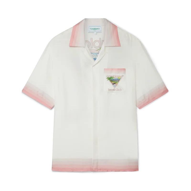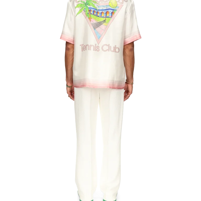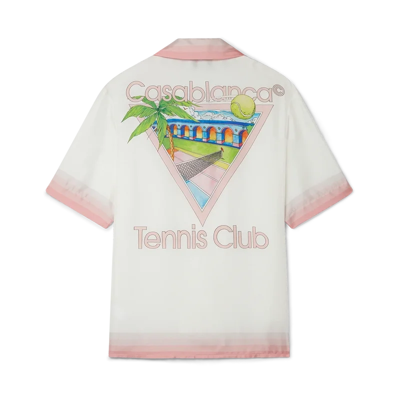 La camisa de seda Tennis Club Icon es un diseño estampado de manga corta que presenta el motivo característico de la casa reinterpretado para esta temporada, incorporando elementos del tenis, la naturaleza y la arquitectura. Confeccionada en tejido de satén de seda, esta prenda se completa con detalles de rayas degradadas en el cuello, los puños, el bajo y el bolsillo del pecho, cierre con botones y una etiqueta con la marca Casablanca. Diseñada para un ajuste holgado.