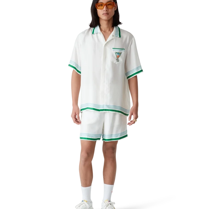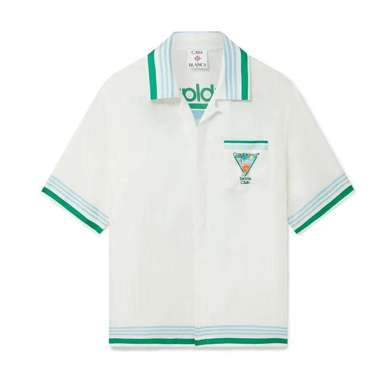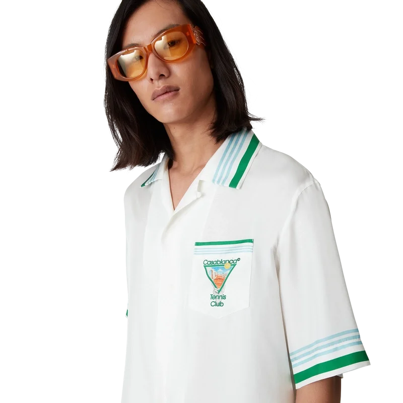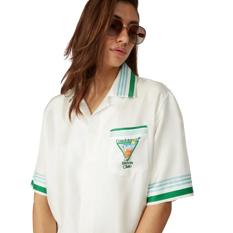 La camisa de seda Metaphysical Tennis Icon es un diseño de manga corta confeccionado en tejido de sarga de seda que presenta el motivo artístico de temporada de la casa, inspirado en el estudio continuo de la belleza clásica y el encanto contemporáneo de la Antigua Grecia, incorporando los elementos de diseño de la casa relacionados con el tenis, la naturaleza y la arquitectura. Se completa con botones de corozo con el logotipo entrelazado CC característico, cierre con botones ocultos, cuello cubano, bolsillo en el pecho y detalles de rayas azules, blancas y verdes en los puños, el cuello y el dobladillo.
