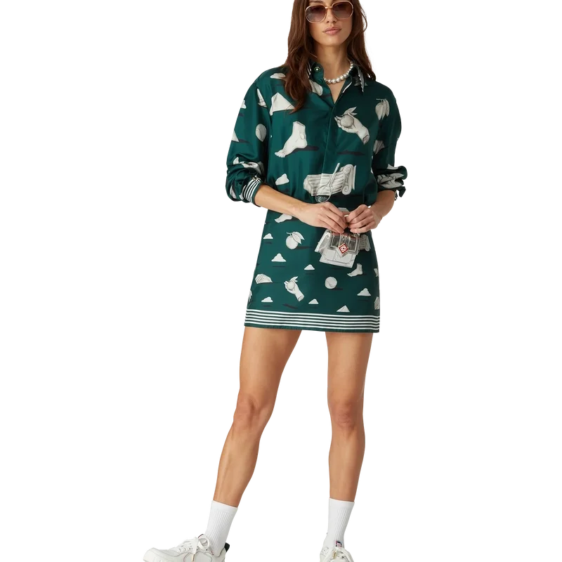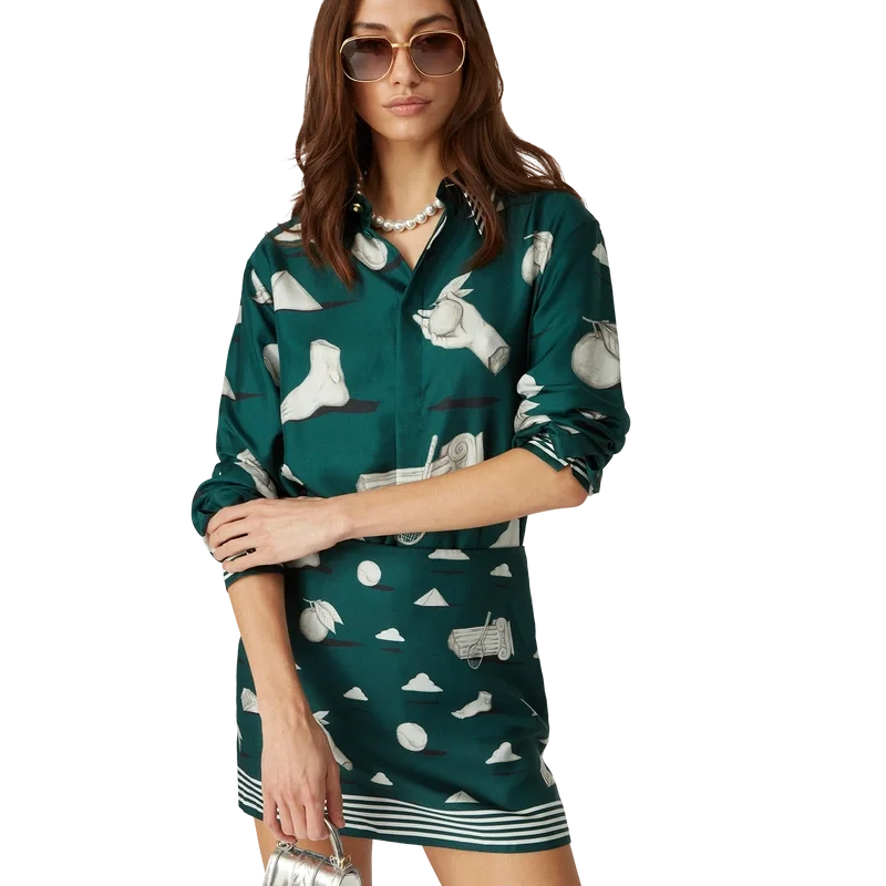 La camisa de seda Metaphysical presenta un diseño estampado en toda la superficie, confeccionada en tejido de sarga de seda, con ilustraciones que representan los elementos de diseño característicos. Se completa con botones esmaltados con borde dorado característicos en los puños y el cuello, cierre frontal con botones de corozo entrelazados con las iniciales «CC», cuello en pico y detalles de rayas en el cuello, los puños y el dobladillo.