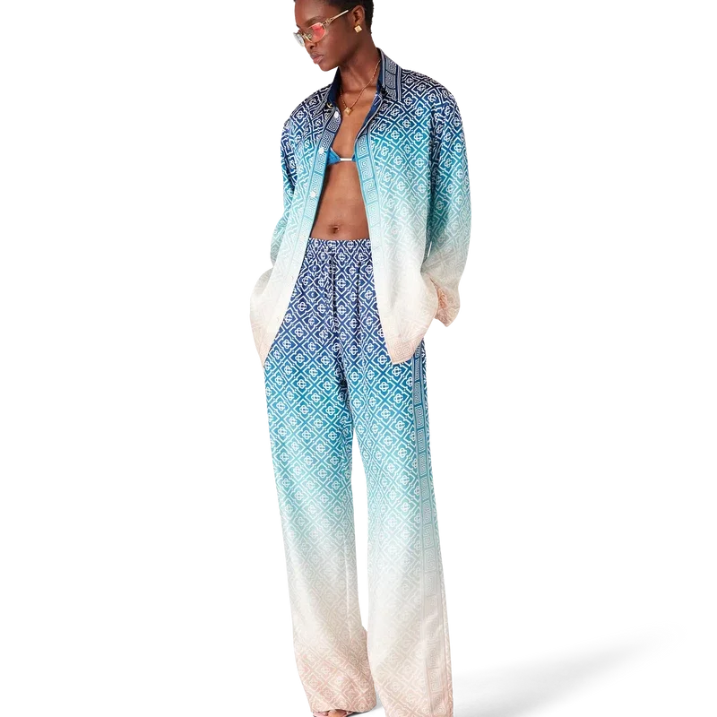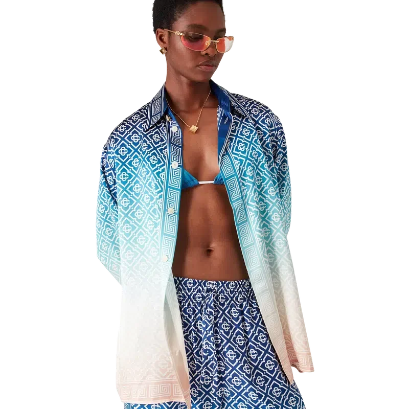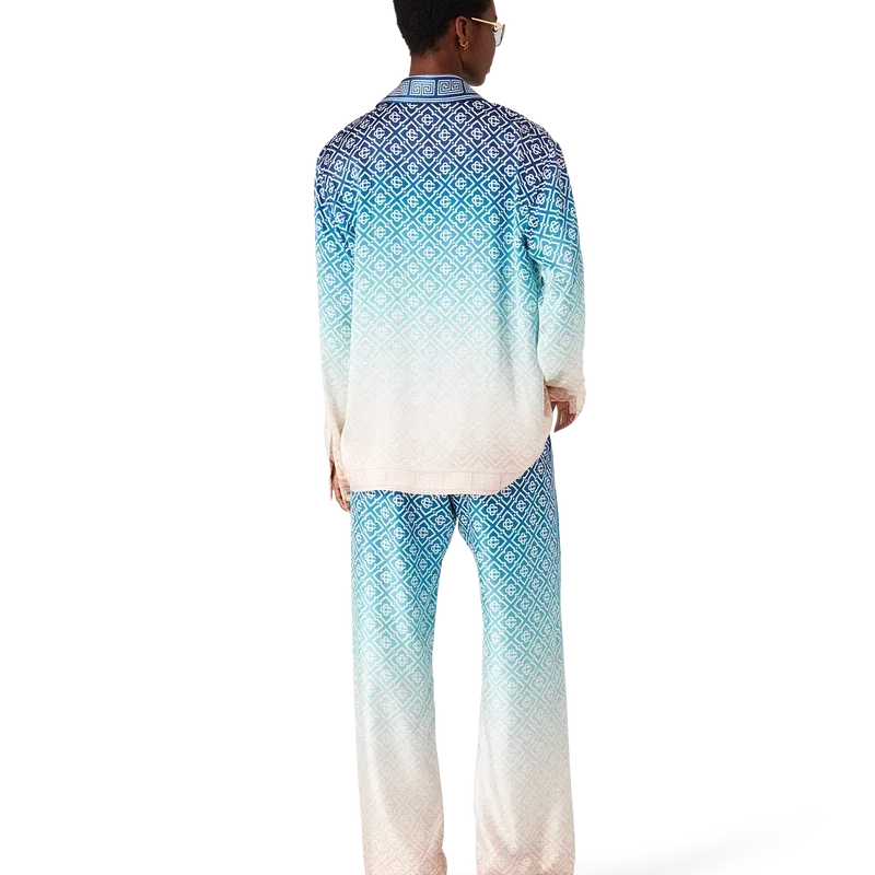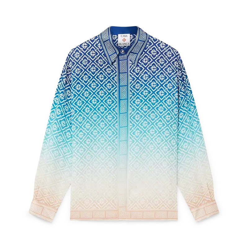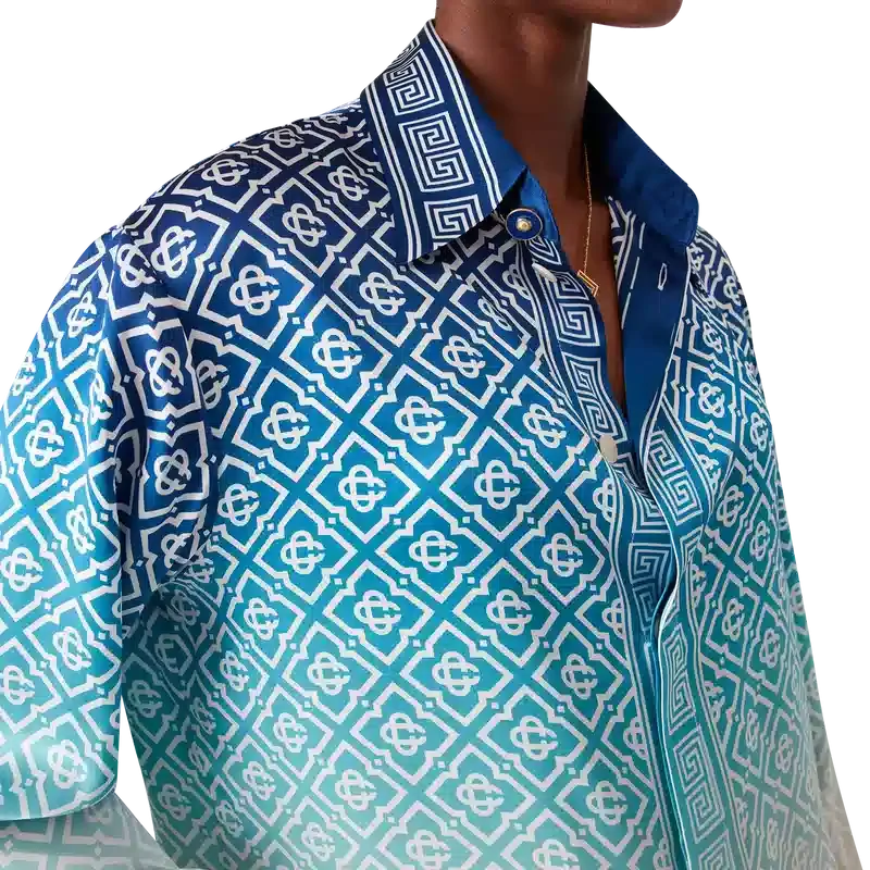 La camisa de manga larga de seda con estampado Jacquard degradado es un diseño con estampado integral de manga larga confeccionado en un tejido de satén de seda con el monograma en degradado. Se completa con cuello, botones esmaltados con ribete dorado en las mangas y el cuello, cierre frontal con botones de corozo con el logotipo entrelazado de Cc, y detalle de borde inspirado en el motivo «Greek Key» en el cuello, los puños, la tapeta y el dobladillo.