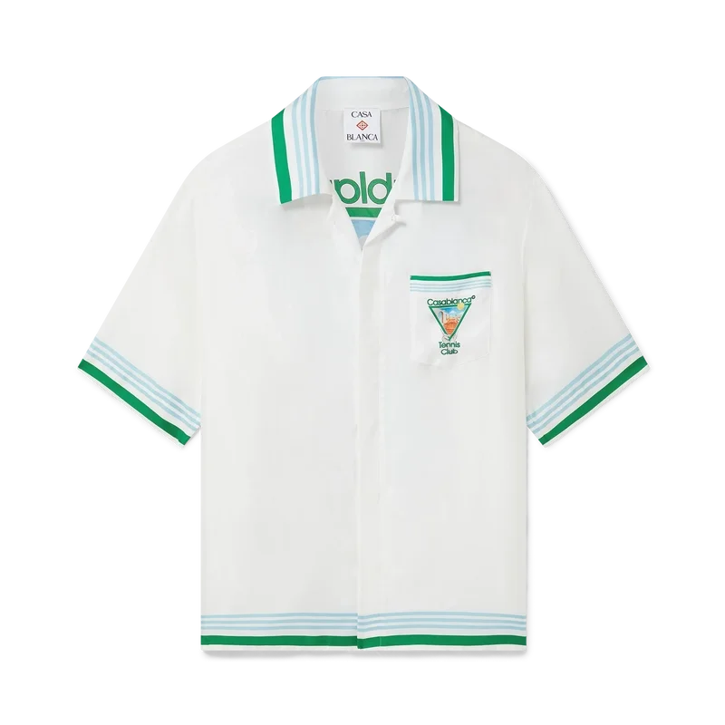 La camisa de seda Metaphysical Tennis Icon es un diseño de manga corta confeccionado en tejido de sarga de seda que presenta el motivo artístico de temporada de la casa, inspirado en el estudio continuo de la belleza clásica y el encanto contemporáneo de la Antigua Grecia, incorporando los elementos de diseño de la casa relacionados con el tenis, la naturaleza y la arquitectura. Se completa con botones de corozo con el logotipo entrelazado CC característico, cierre con botones ocultos, cuello cubano, bolsillo en el pecho y detalles de rayas azules, blancas y verdes en los puños, el cuello y el dobladillo.