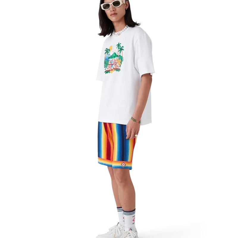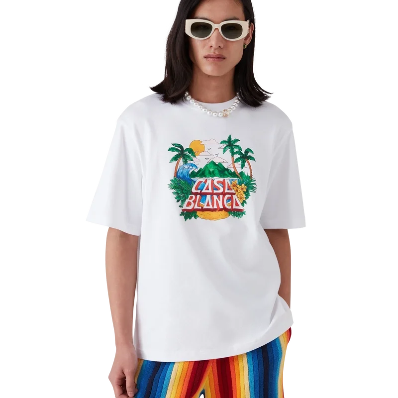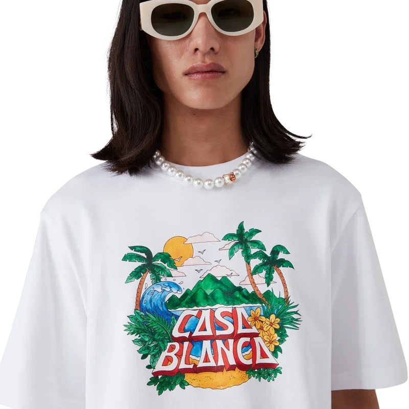 La camiseta Casa Beach Wave es un diseño estampado de manga corta confeccionado en tejido de algodón orgánico y presenta un diseño característico que hace referencia a las camisetas de recuerdo que uno compraría en unas vacaciones en la playa. Se completa con un cuello redondo clásico.