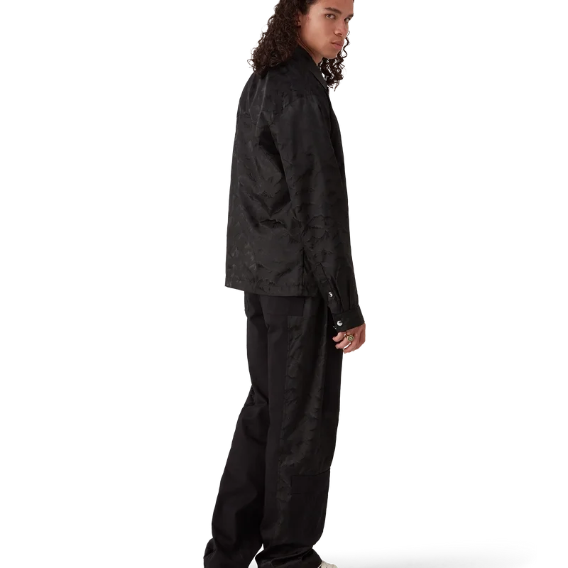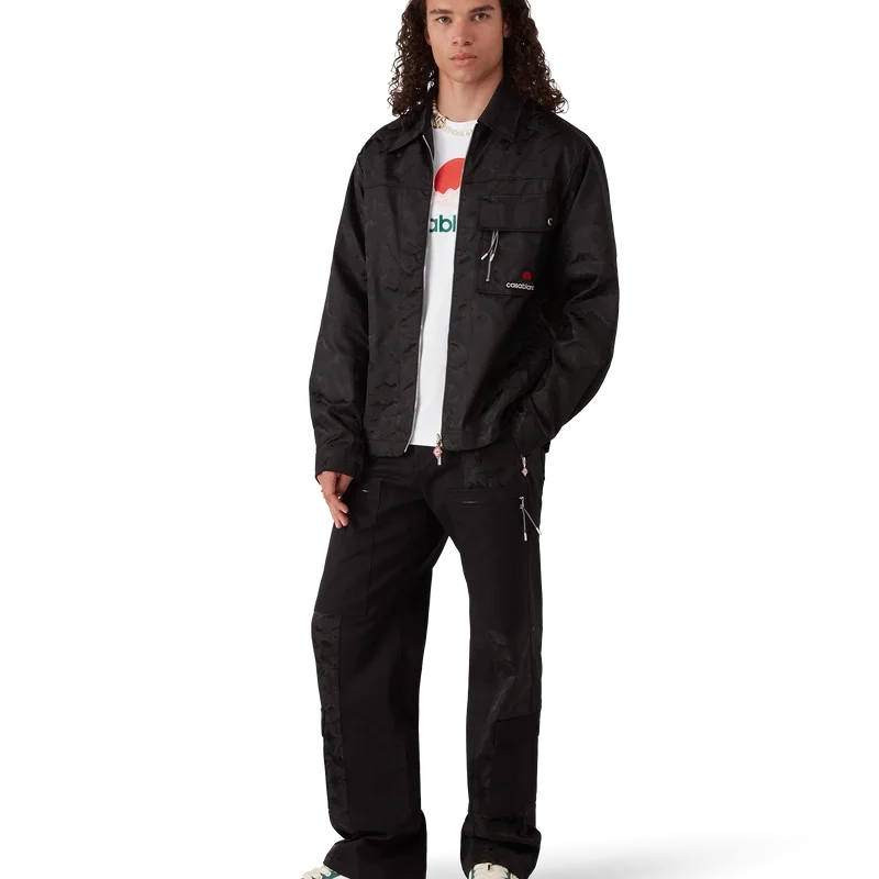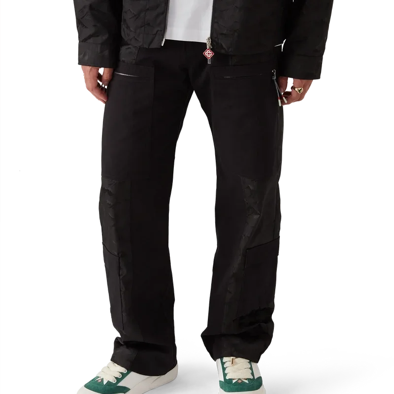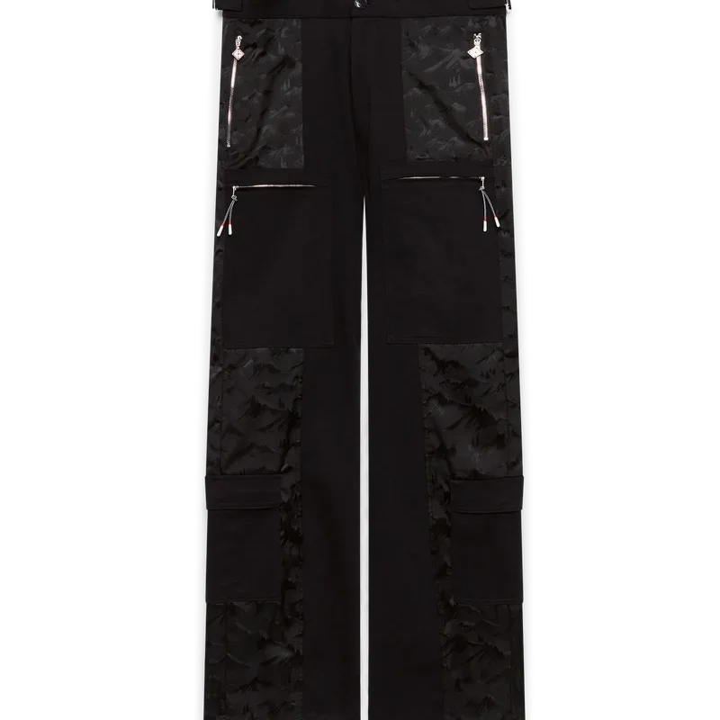 Los pantalones cargo de nylon con estampado de camuflaje de montaña presentan un diseño de pierna recta confeccionado en tejido de nylon jacquard y algodón. Cuentan con bolsillos en las costuras con cierre de cremallera y tiradores con el emblemático logotipo de diamante de la casa, forro, bolsillos de parche en la parte superior de los muslos con cierre de cremallera y tiradores inspirados en cuerdas de alpinismo, bolsillos con solapa en la parte inferior de las piernas, bolsillos de parche traseros, cierre de cremallera y ajustadores laterales.