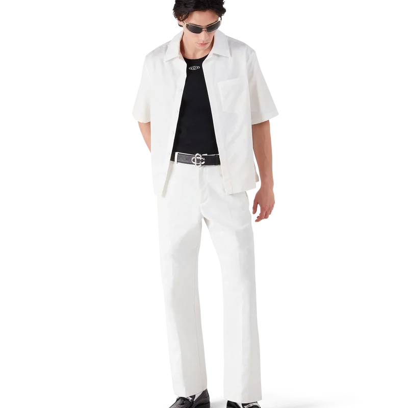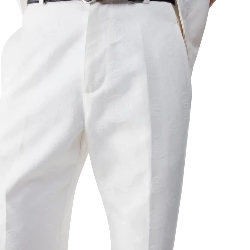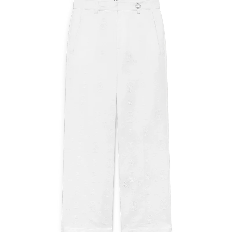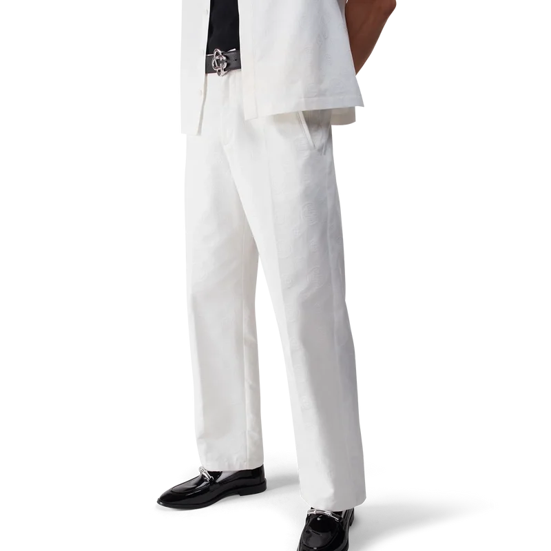 Los pantalones chinos blancos con monograma presentan un diseño refinado de corte recto con el icónico estampado Monogram de la casa. Cuentan con cintura, trabillas con remaches con el logotipo CC entrelazado de la casa, cierre de cremallera, bolsillos delanteros en diagonal y bolsillos traseros.