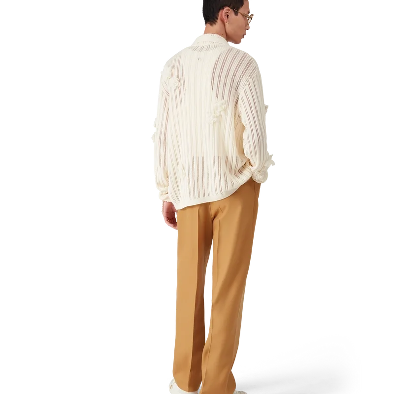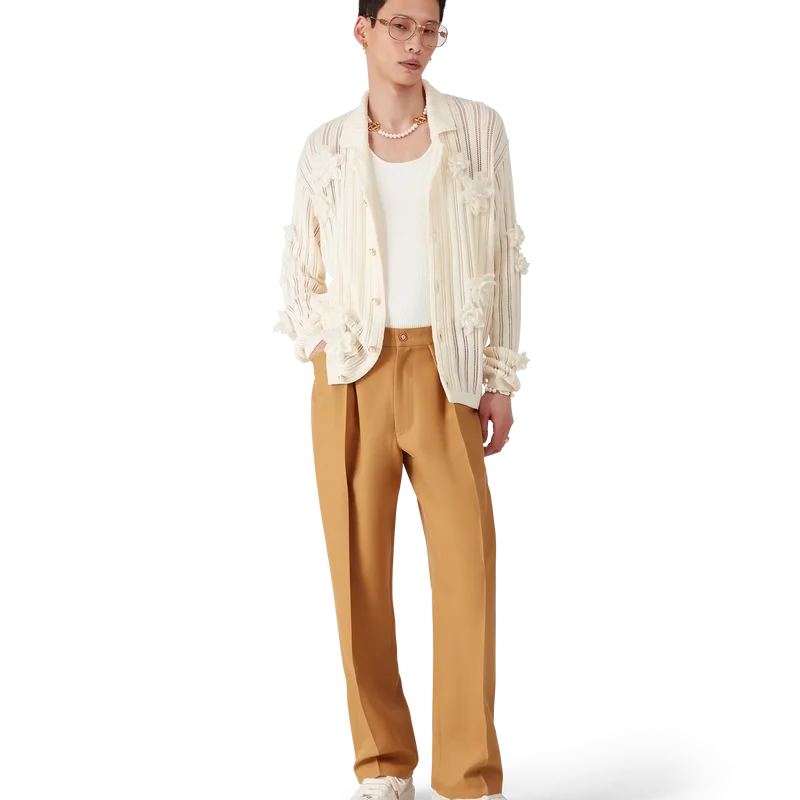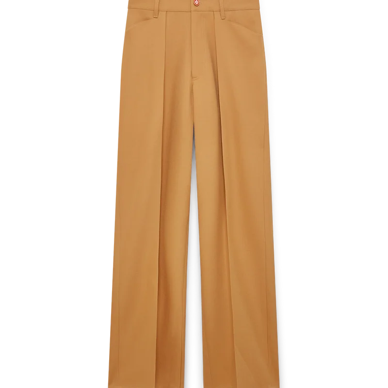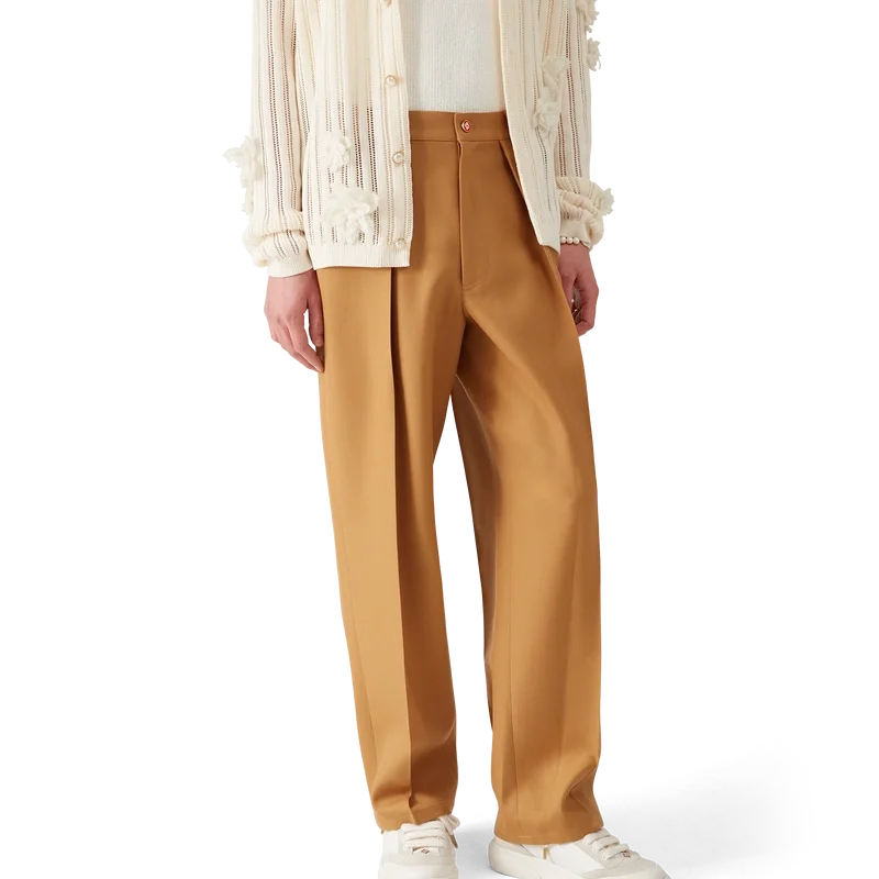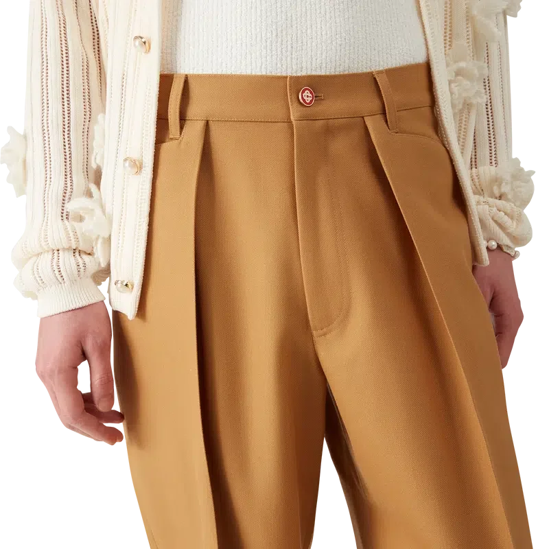 Los pantalones chinos plisados presentan un diseño de pierna cónica confeccionado en tejido de lana, con un forro de mezcla de algodón. Se completan con trabillas, cierre de cremallera, bolsillos delanteros, pliegues diagonales y bolsillos traseros de ojal con cierre de botón esmaltado con borde dorado y logotipo CC entrelazado.<!–