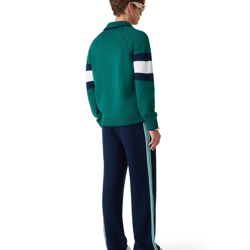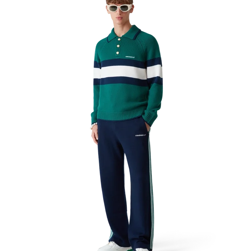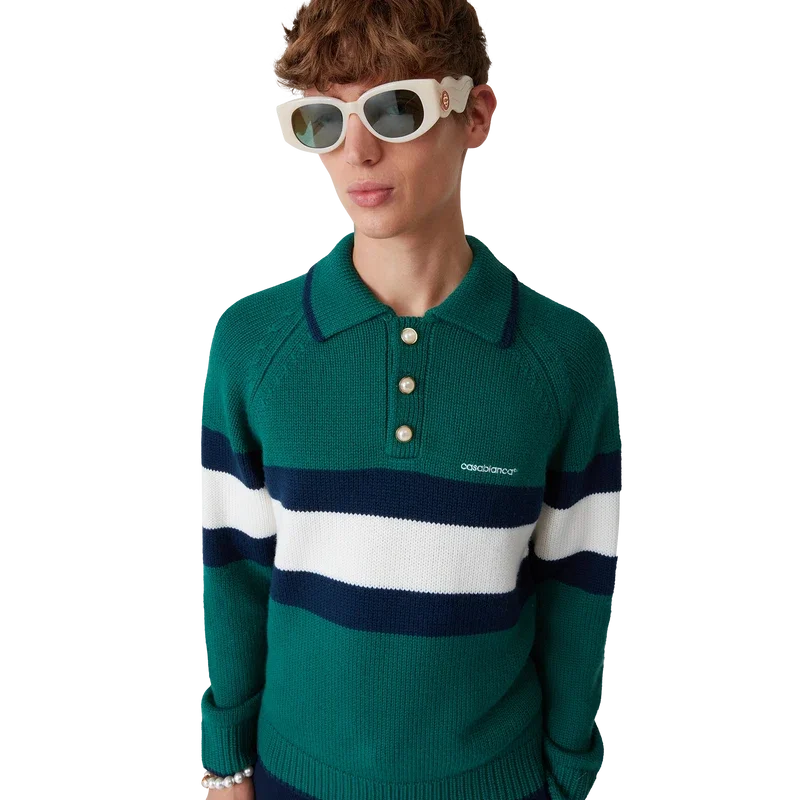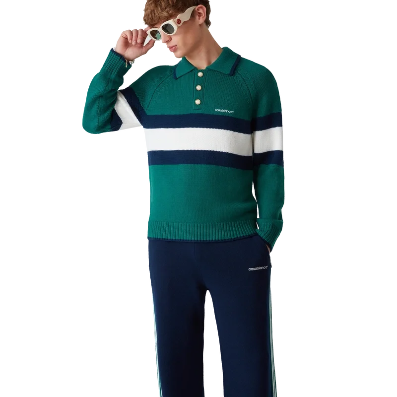 La camiseta con bloques de color es un diseño de manga larga confeccionado en tejido de lana merina y presenta una raya azul y blanca que recorre el pecho y la espalda. Se completa con mangas raglán, puños, dobladillo y cuello acanalados, botones de perla con borde dorado característicos y el logotipo de Casablanca.