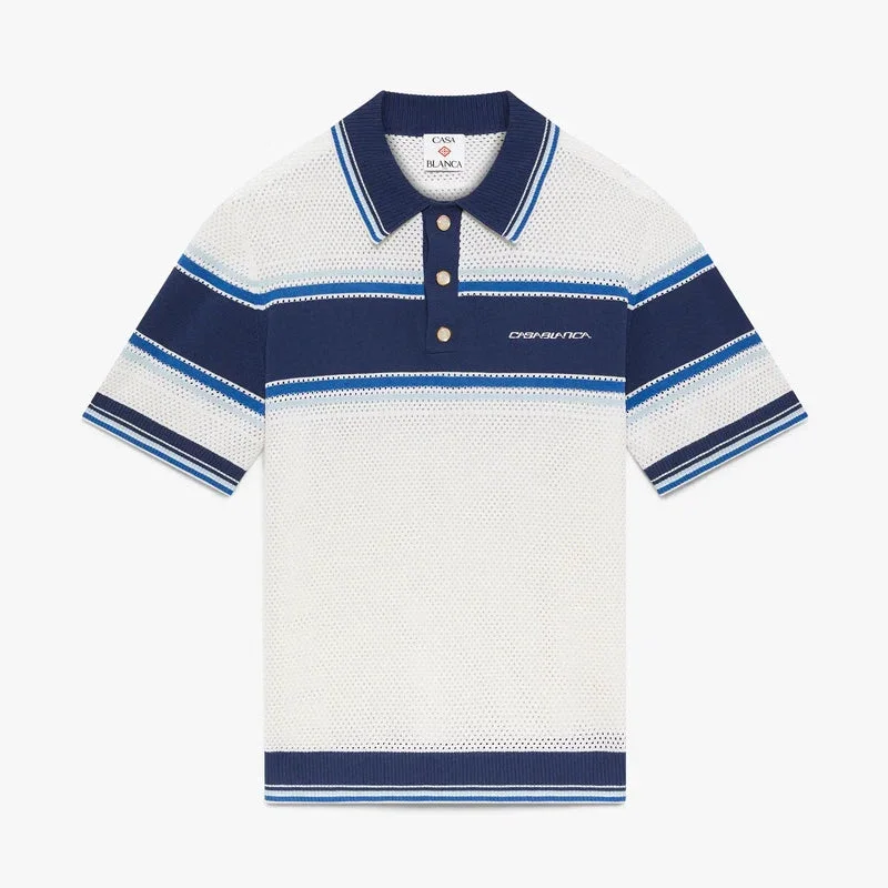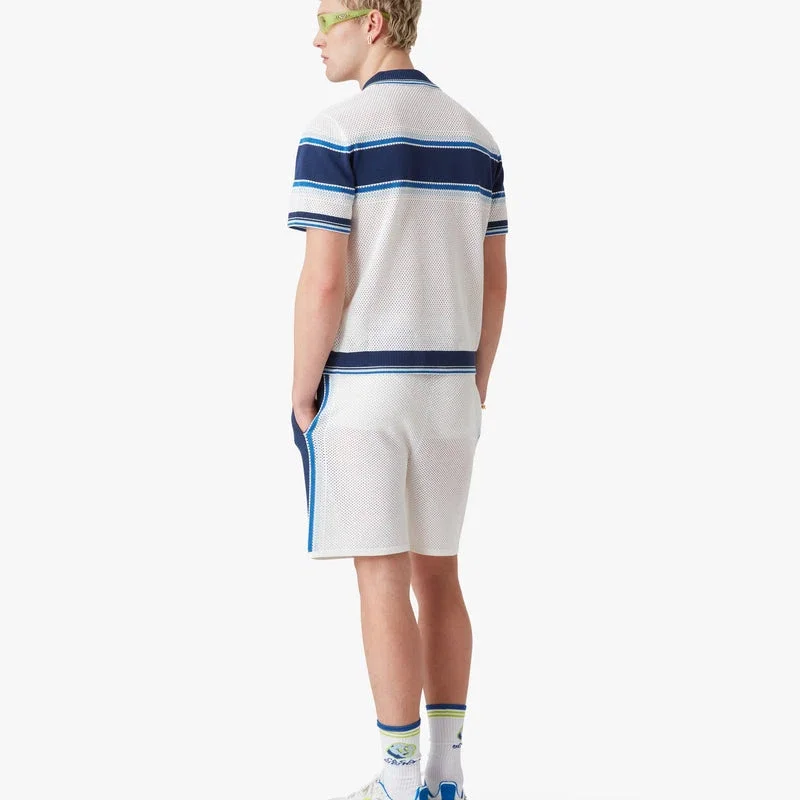 El polo de manga corta de malla a rayas presenta un diseño refinado, con una raya azul que recorre el pecho, las mangas y la espalda. Se completa con cuello, puños y bajo con detalles de ribete a rayas, cierre de botones y botones de perla con borde dorado característicos.