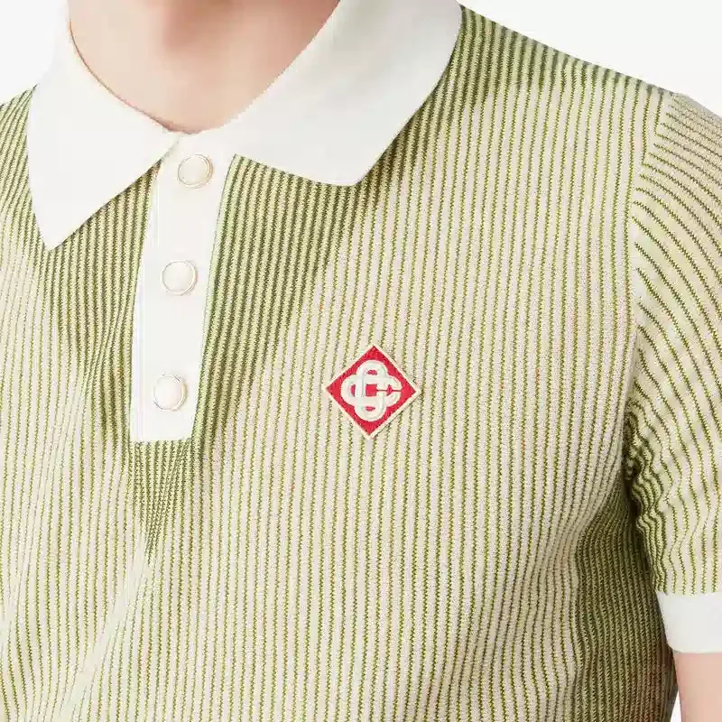 El polo de manga corta con rayas verticales presenta un diseño de punto refinado y una silueta holgada. Se completa con cuello y tapeta en contraste, cierre de botones, botones de perla con ribete dorado característicos de la marca, puños y dobladillo acanalados, y el logotipo de la casa en las mangas.
