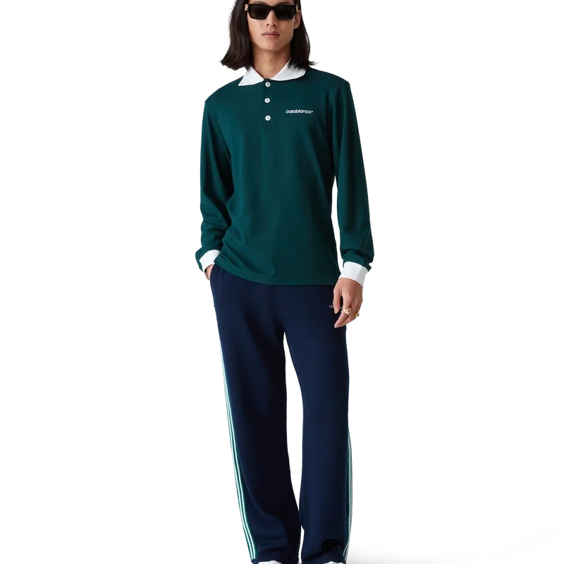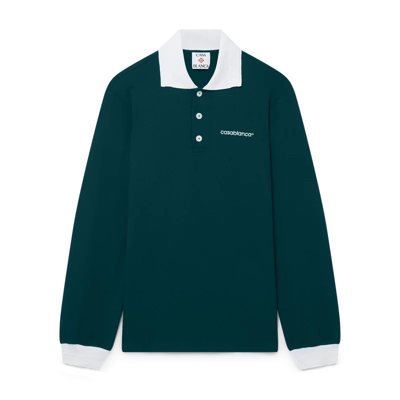 La camisa de manga larga es un diseño clásico confeccionado en tejido de mezcla de poliéster. Se completa con el clásico cierre de tres botones, cuello y puños acanalados en contraste con detalles en los bordes inspirados en el motivo griego y el logotipo «Casablanca» bordado.