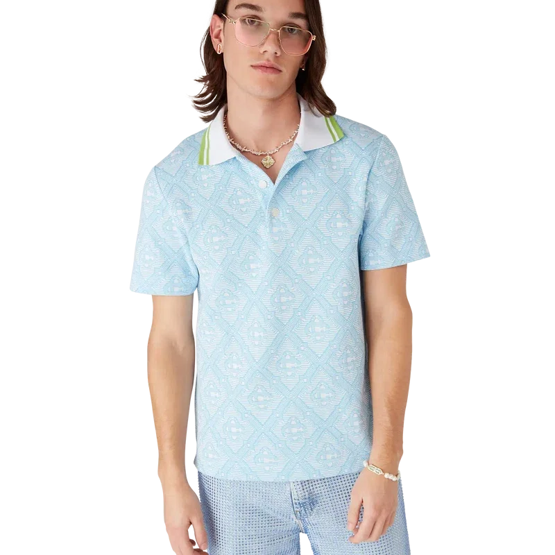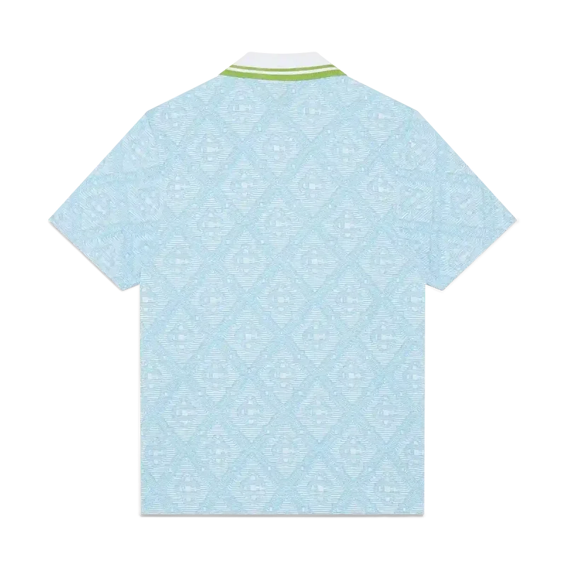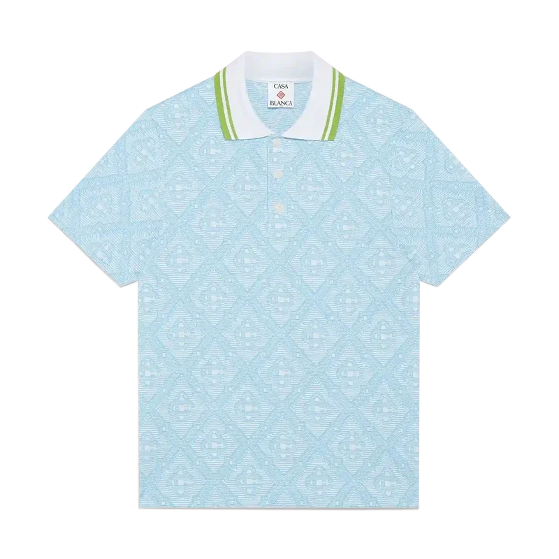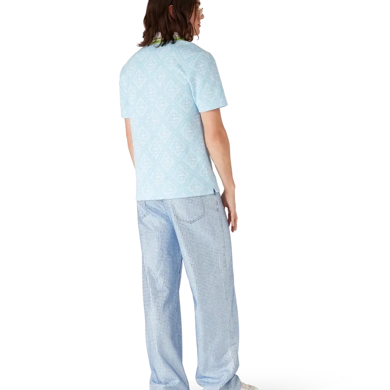 El polo de manga corta de jacquard azul claro es un diseño clásico que luce el monograma característico de la casa. Se completa con un cuello acanalado con detalle de ribete a rayas en contraste, cierre de botones y botones de corozo con el logotipo «CC» entrelazado.