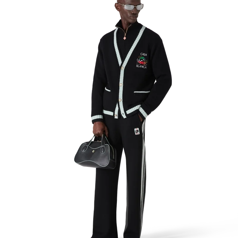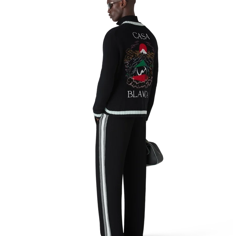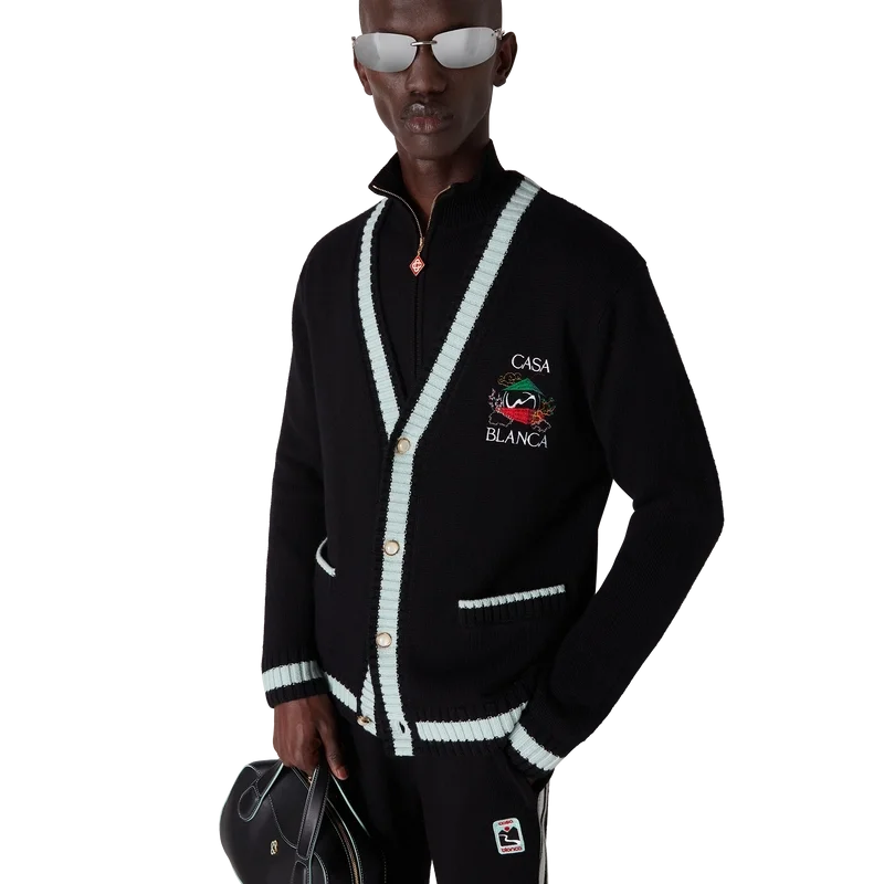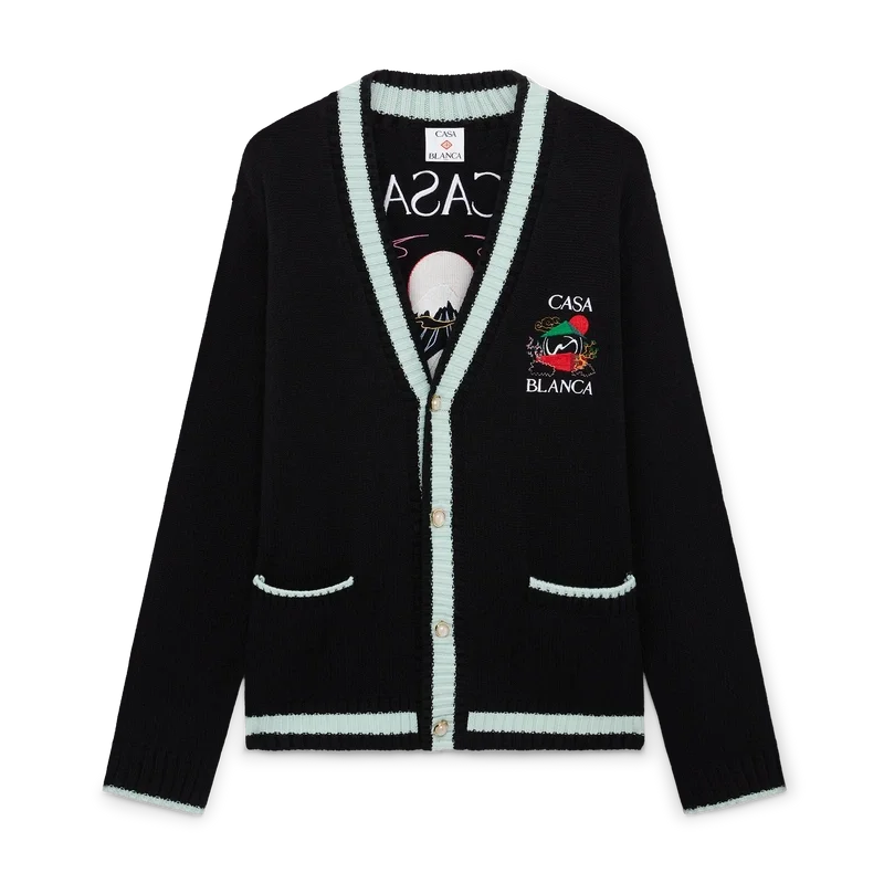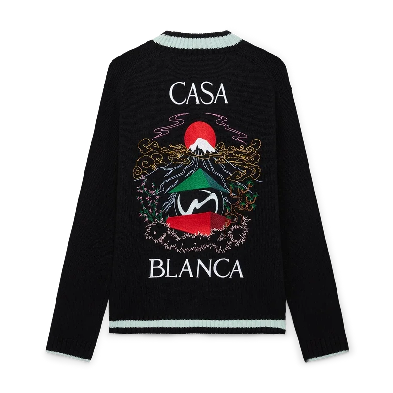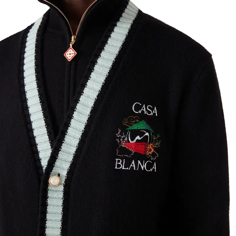 El cárdigan Casa Mountain Temple es un diseño de manga larga con motivos bordados de temporada, confeccionado en tejido de lana merino. Se completa con un cuello redondo clásico, puños y bajo acanalados.