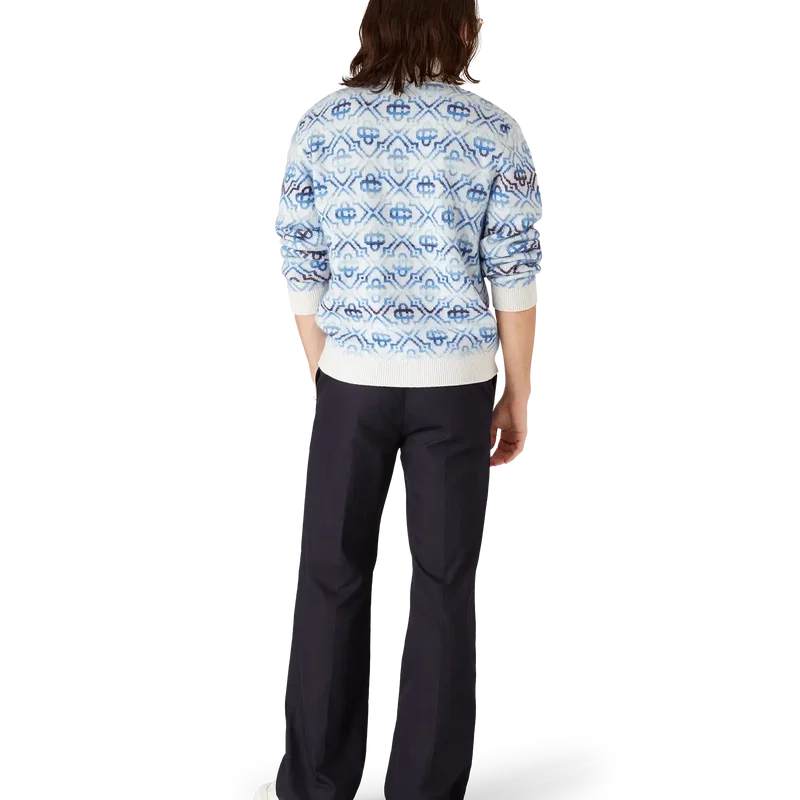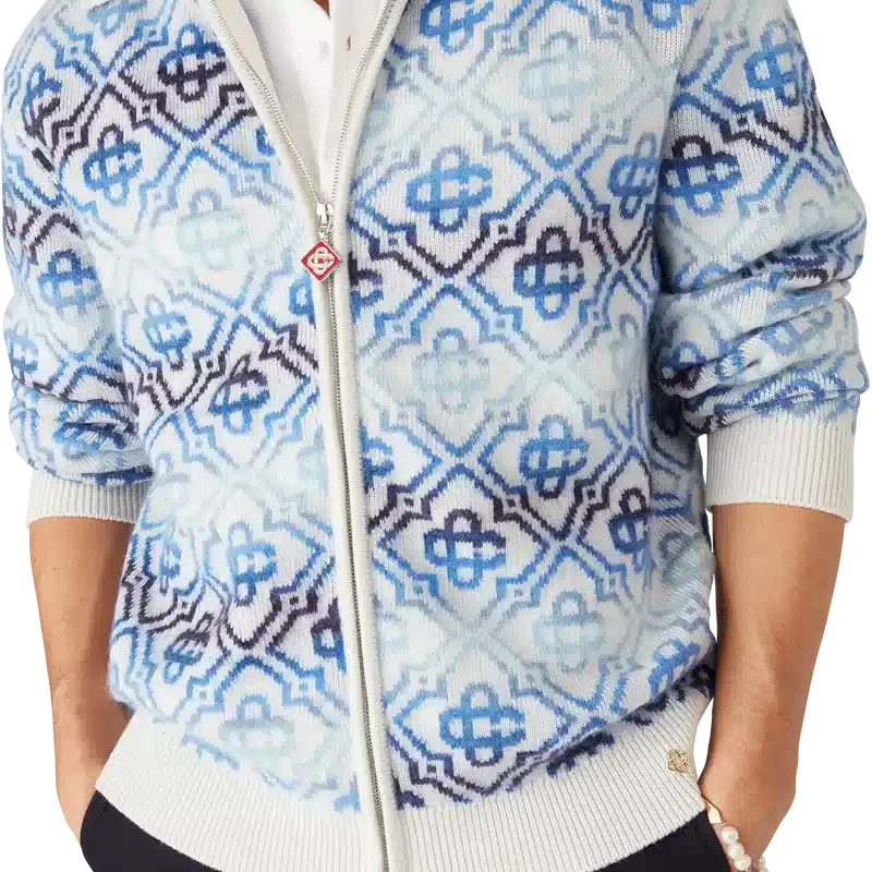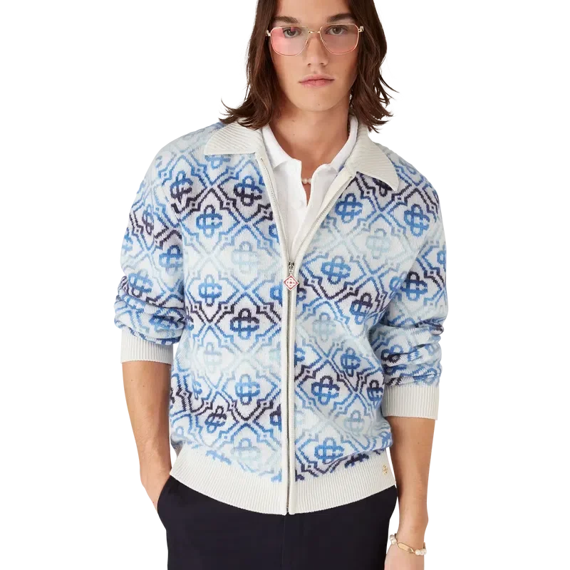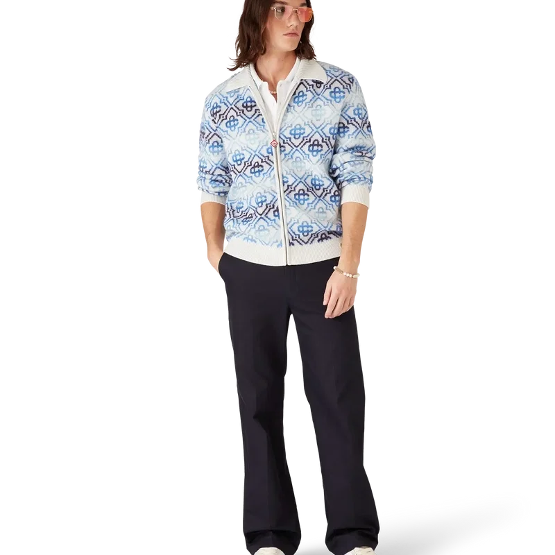 El cárdigan de merino de manga larga con monograma y teñido espacial es un diseño de punto refinado que presenta el monograma característico de la casa en un degradado azul, confeccionado con hilos teñidos espacialmente que crean profundidad y dimensión. Se completa con un cierre de cremallera con la lengüeta con el logotipo Diamond Monogram característico de la casa, y detalles de cuello, puños y bajo acanalados.