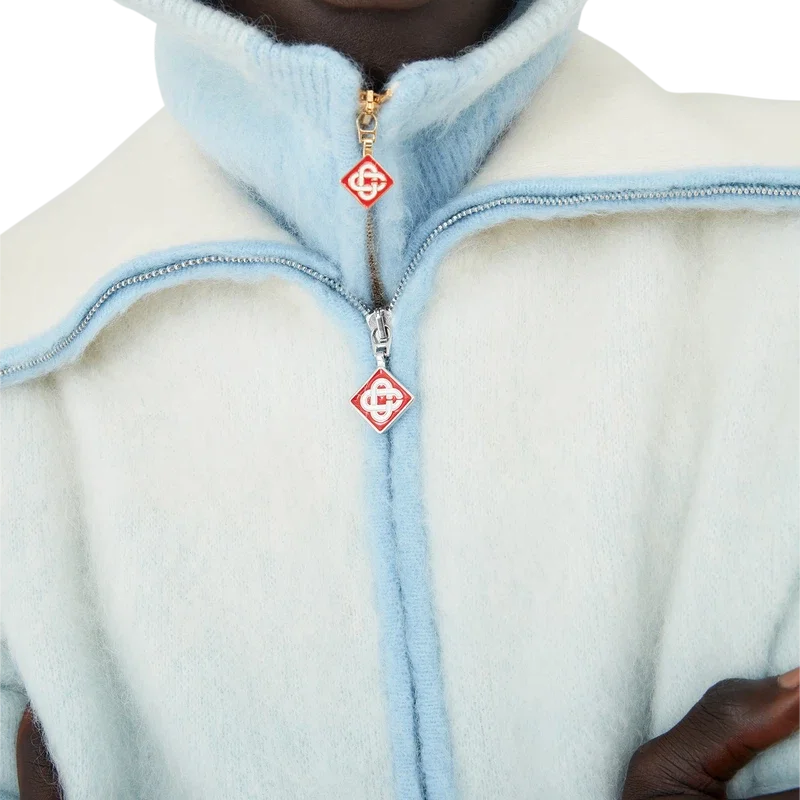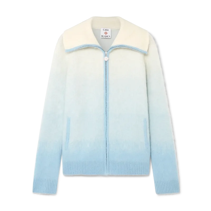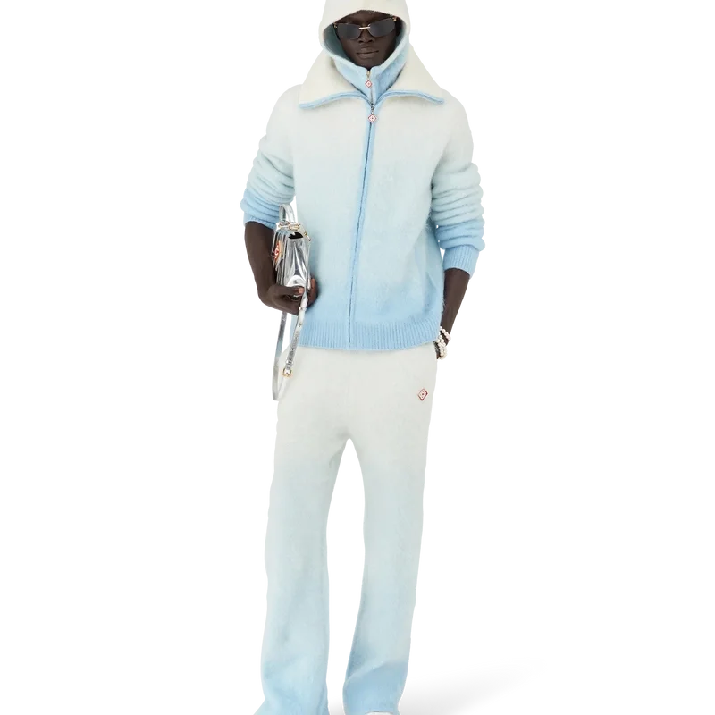 El jersey de esquí es un diseño refinado de estilo «après-sport» confeccionado en tejido de mezcla de mohair, con un degradado azul y blanco inspirado en el crepúsculo sobre la campiña nevada de Japón. Evoca la transición en la que la luz del día que se desvanece se encuentra con la nieve recién caída en los valles montañosos rurales y los arroyos helados que serpentean a través de las tierras de cultivo de Hokkaido.