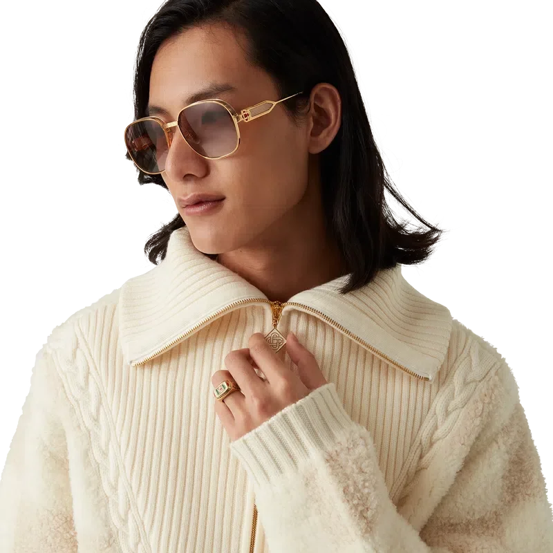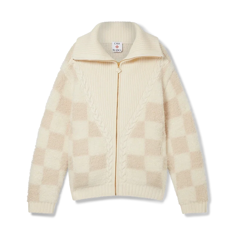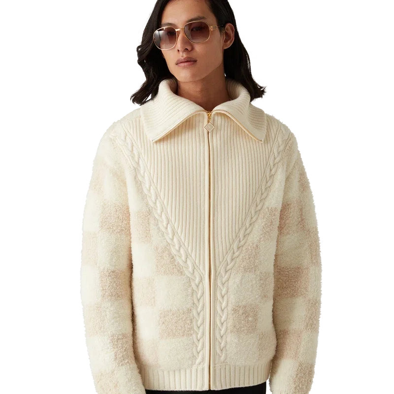 La chaqueta de forro polar de merino es un diseño de punto de manga larga confeccionado en tejido de lana merino con un estampado a cuadros. Cuenta con cierre de cremallera, panel acanalado en forma de V, cuello, puños y bajo