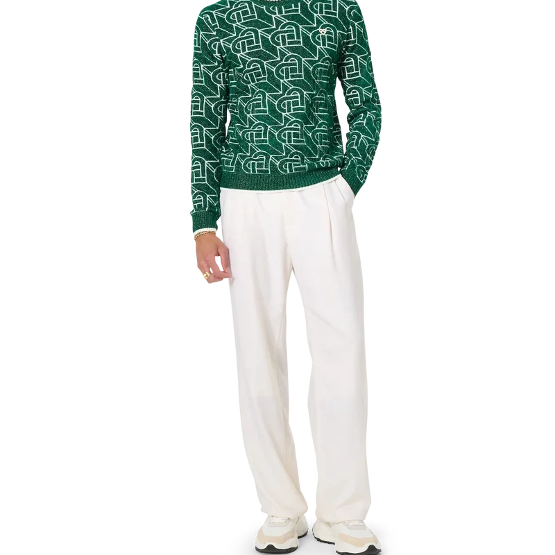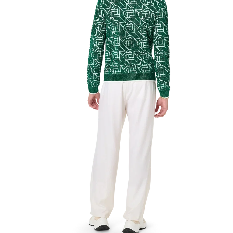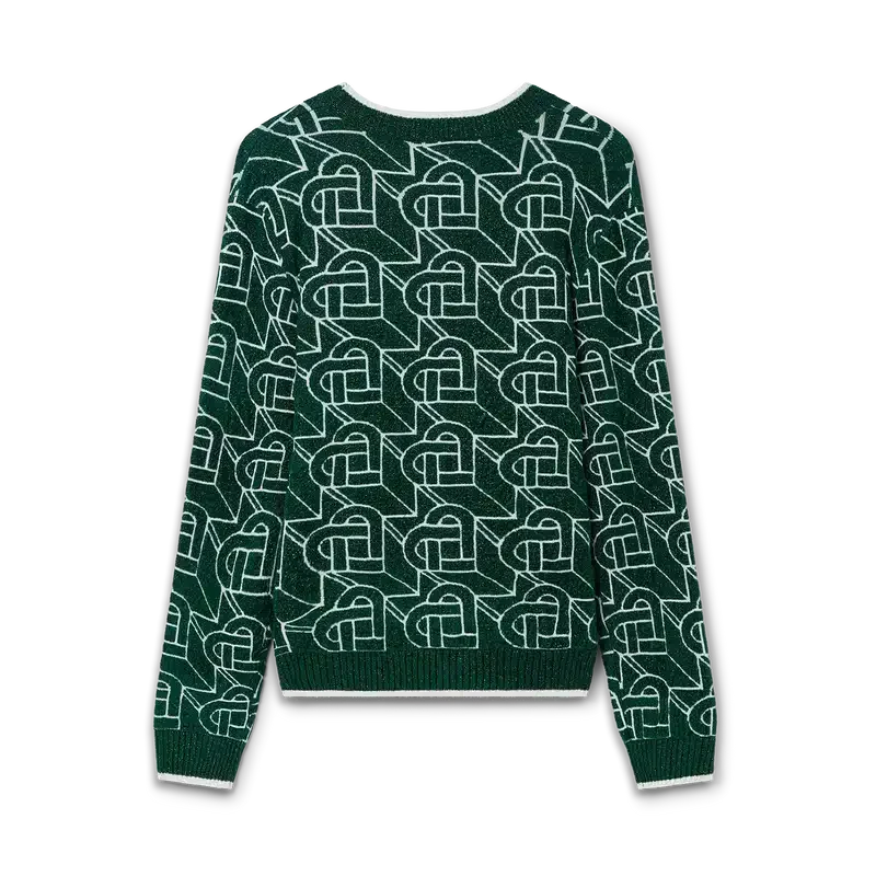 El jersey con monograma de corazones es un modelo de punto de manga larga que presenta el diseño característico de la casa con un monograma de corazones por toda la prenda y toques de hilos dorados, rematado con el remache de corazón esmaltado y chapado en oro de la casa, y una etiqueta con la marca Casablanca.