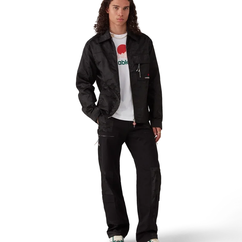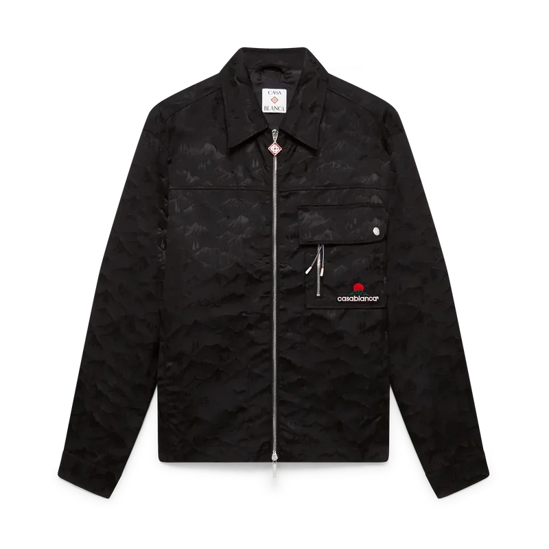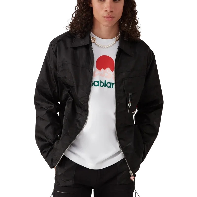 La camisa de nylon Mountain Camo con cremallera es un diseño de manga larga confeccionado en tejido jacquard con el emblemático logotipo de diamantes de la casa. Se completa con cuello en punta, cierre de cremallera con la lengüeta con el logotipo del diamante característico de la casa, un bolsillo con solapa en el pecho con cremallera vertical y cordones inspirados en los de las cuerdas de escalada de esta temporada, herrajes con el logotipo de la marca en los puños y el bolsillo, y el logotipo «Casa Montagne» de la casa, un logotipo que a primera vista parece una montaña, pero que al mirarlo más de cerca se lee como «Casa».