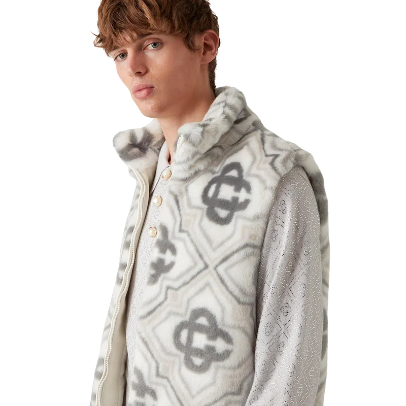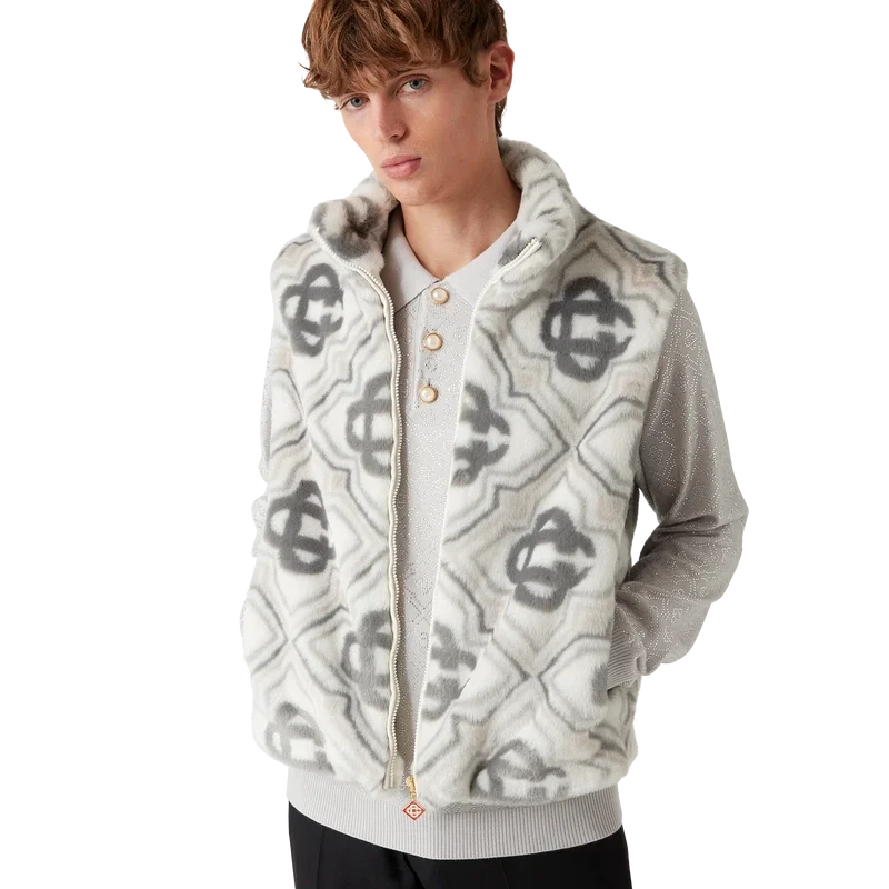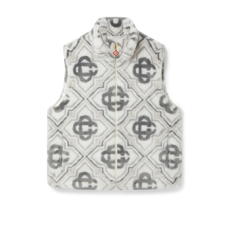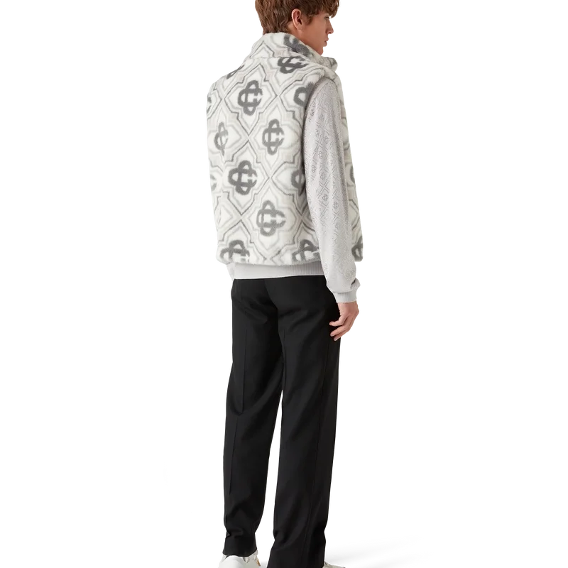El chaleco de pelo sintético con monograma es un diseño sin mangas, lujoso y de textura suave, confeccionado en tejido de pelo sintético jacquard con el logotipo Diamond Monogram de la casa. Se completa con cierre de cremallera frontal, bolsillos laterales verticales ribeteados, forro y cuello de banda.