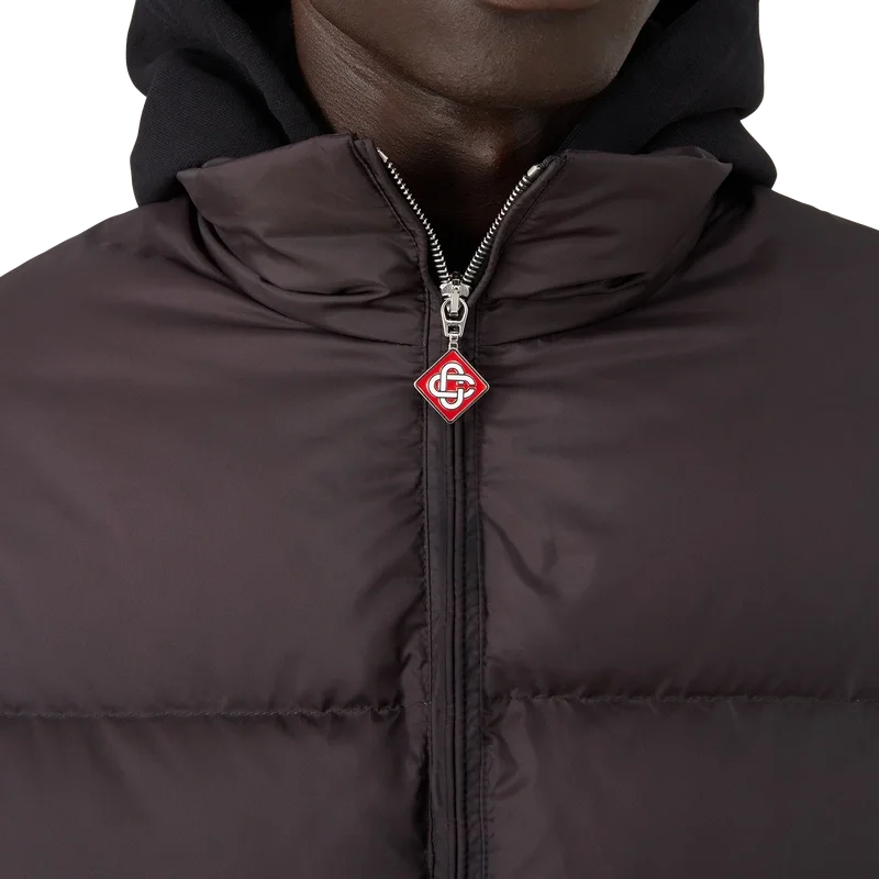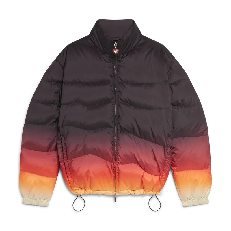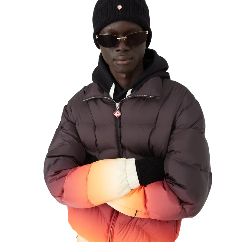 La chaqueta acolchada de esquí es una prenda de ropa de abrigo de diseño refinado confeccionada en tejido acolchado de plumón con estampado degradado, que presenta un degradado multicolor inspirado en las espectaculares puestas de sol sobre las cordilleras nevadas de Japón. Se inspira en momentos impresionantes en los que los cielos vibrantes se transforman sobre paisajes rurales invernales. Se completa con un cierre de cremallera con la lengüeta con el logotipo de diamantes característico de la casa, bolsillos delanteros con cierre de cremallera, bolsillo para el forfait en el brazo izquierdo y dobladillos y puños elásticos.