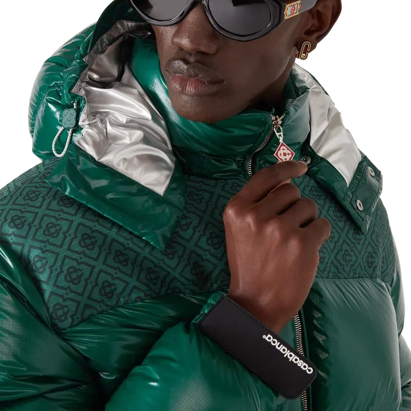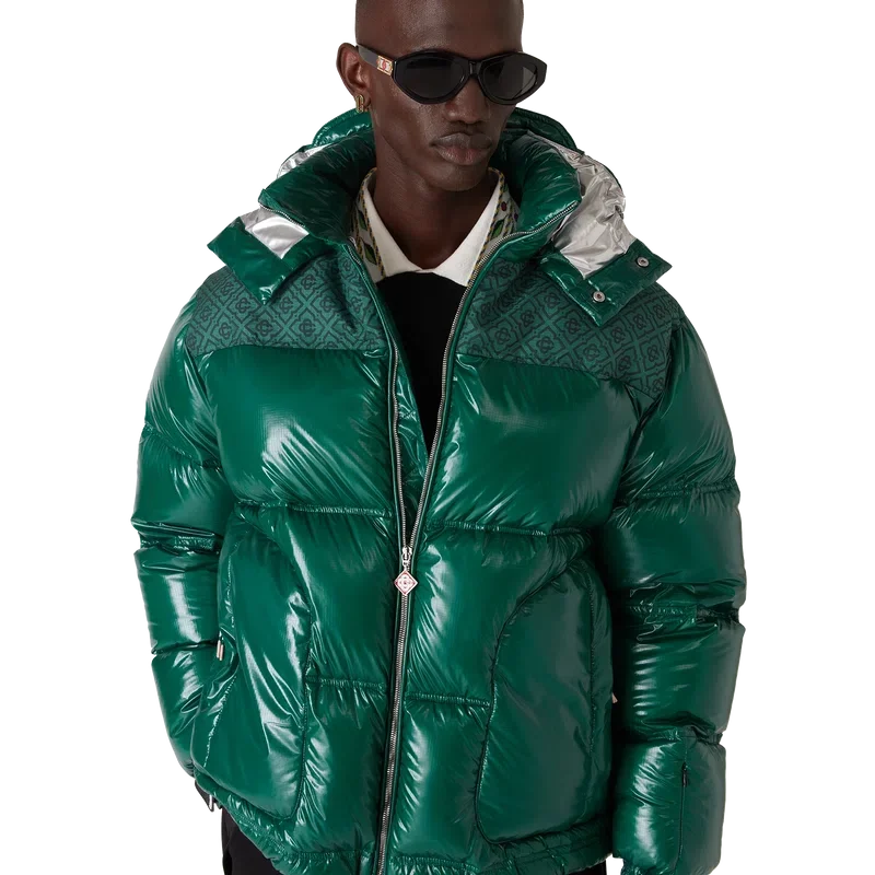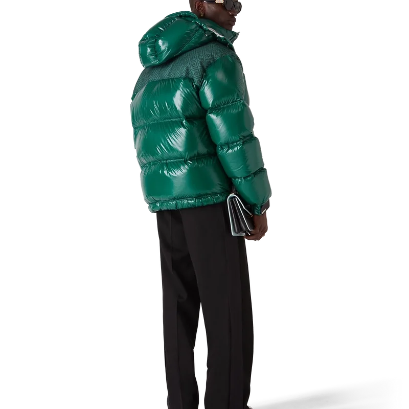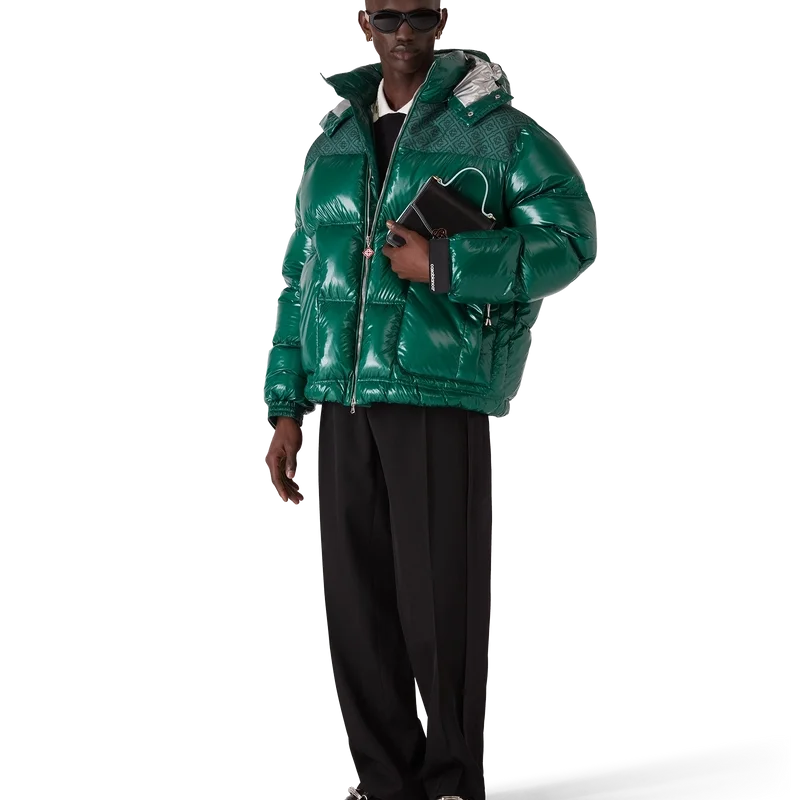 La chaqueta acolchada de nylon es una prenda de ropa de abrigo de corte cuadrado y diseño moderno, confeccionada en tejido de nylon ripstop con relleno de plumón y un panel de jacquard con el monograma en contraste en los hombros. Se completa con una capucha con cordones y cierres con el logotipo CC, un cuello alto que proporciona calor adicional y protección contra las inclemencias del tiempo, un cierre de cremallera con la lengüeta con el logotipo de diamante característico de la casa, bolsillos delanteros con cierre de cremallera, correas ajustables con el logotipo de la marca en los puños y dobladillo y puños elásticos.