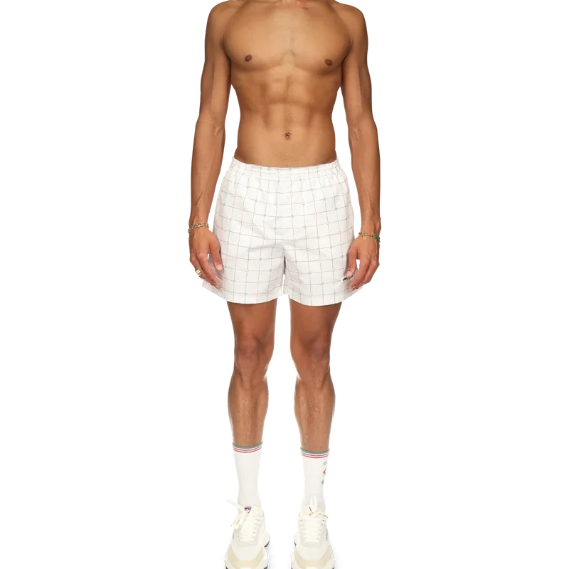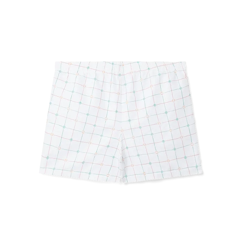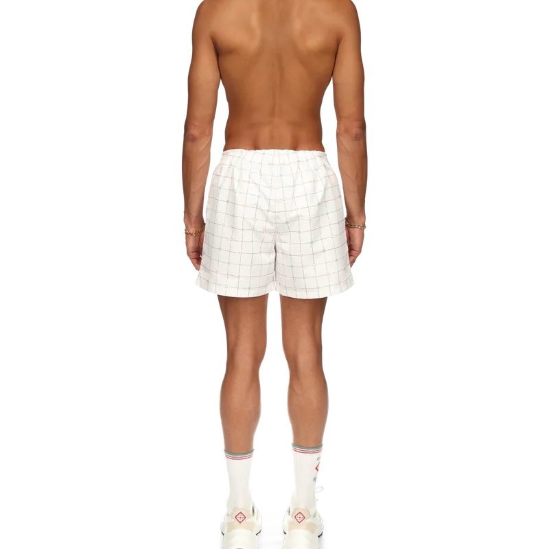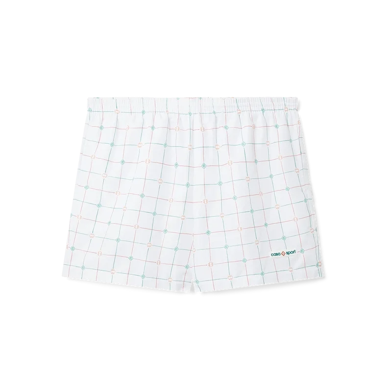 Los pantalones cortos de cuadros de tenis están confeccionados en tejido técnico de poliéster con un diseño de cuadros naranjas y verdes de Casablanca Paris. Cuentan con cintura elástica, cierre con cordón y bolsillos laterales.