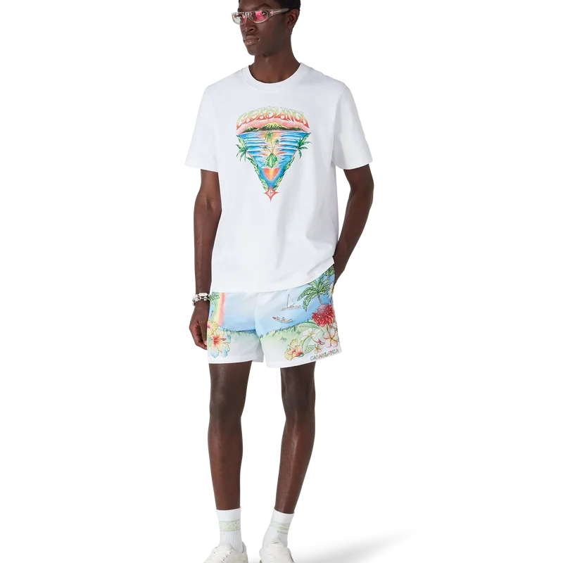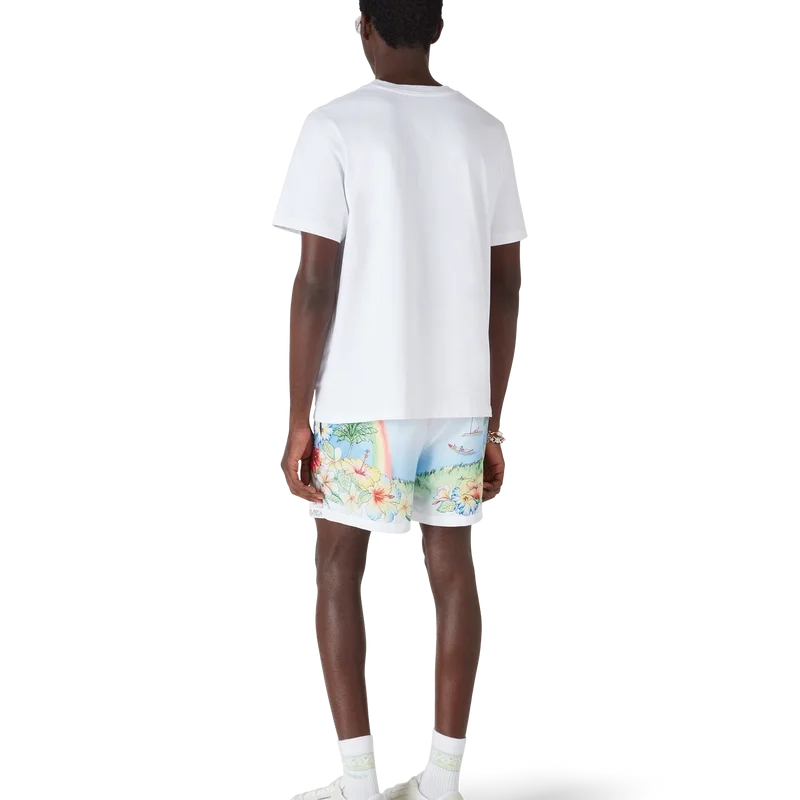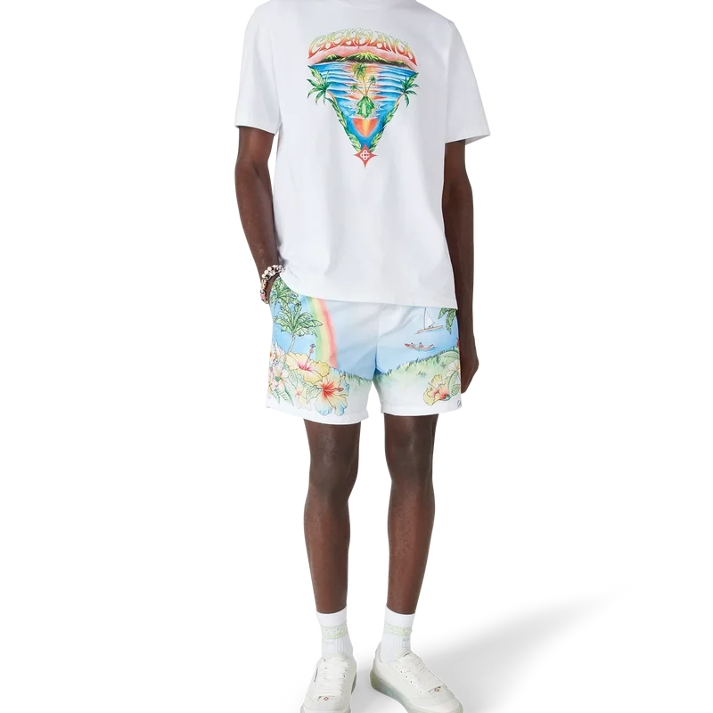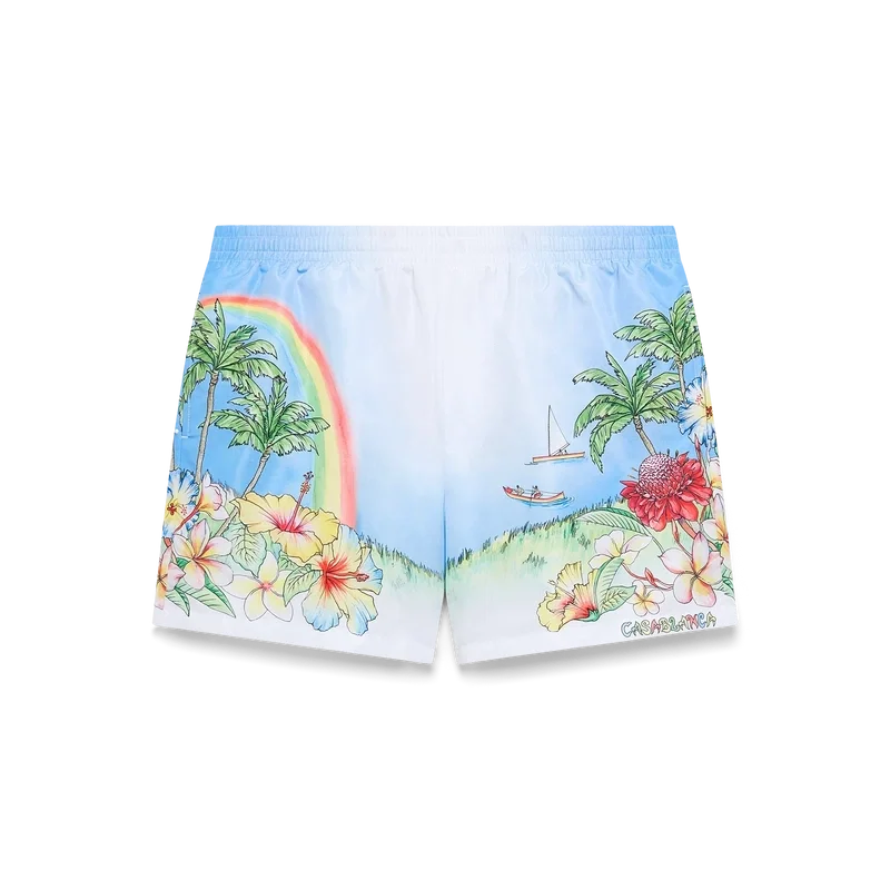 Los pantalones cortos con estampado Aloha presentan un diseño técnico refinado con una vibrante representación pintada de Kauai, Hawái, que muestra su paraíso montañoso, cascadas, delfines juguetones, canoas y un arcoíris, con una visión exagerada de la belleza del paisaje. Se completan con una cintura elástica, bolsillos laterales y una confección en tejido técnico de baño que plasma los códigos de lujo deportivo-lazer de la marca.