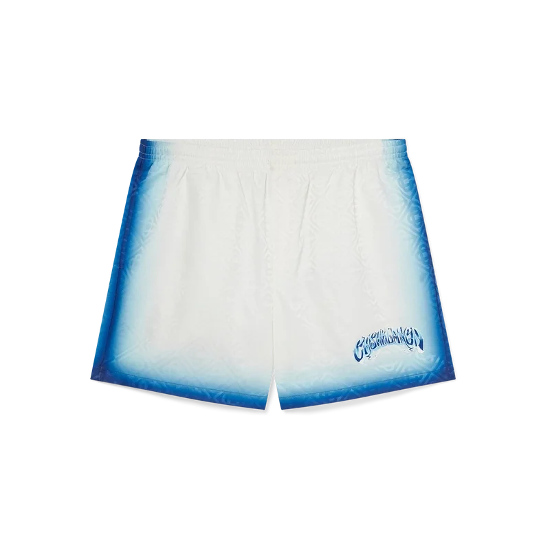 Los pantalones cortos Blue Fade presentan un diseño estampado con el logotipo de la casa Casablanca en una tipografía dibujada a mano inspirada en la tipografía gótica utilizada en los tatuajes. Confeccionados en tejido de poliéster y acabados con cintura elástica, cordón de ajuste interno, bolsillos laterales en las costuras, forro y bolsillo interior.
