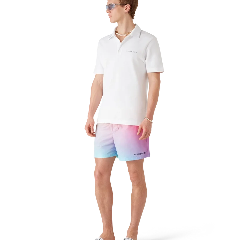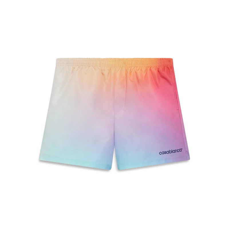 Los pantalones cortos con estampado degradado presentan un diseño refinado con la combinación de colores degradados de la temporada. Cuentan con cintura elástica, cordón interior, bolsillos laterales en las costuras, forro, detalle de rayas en el bajo y el logotipo de la marca.