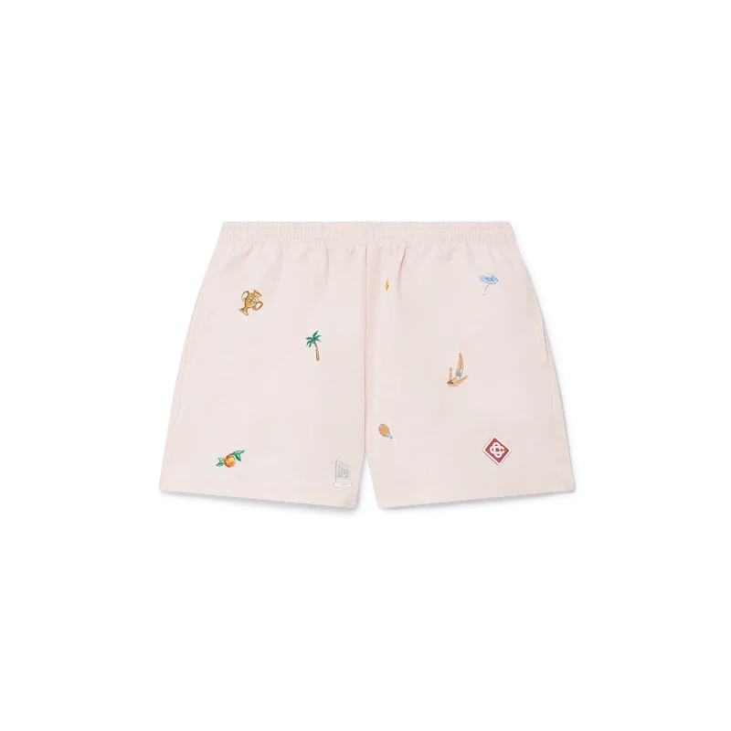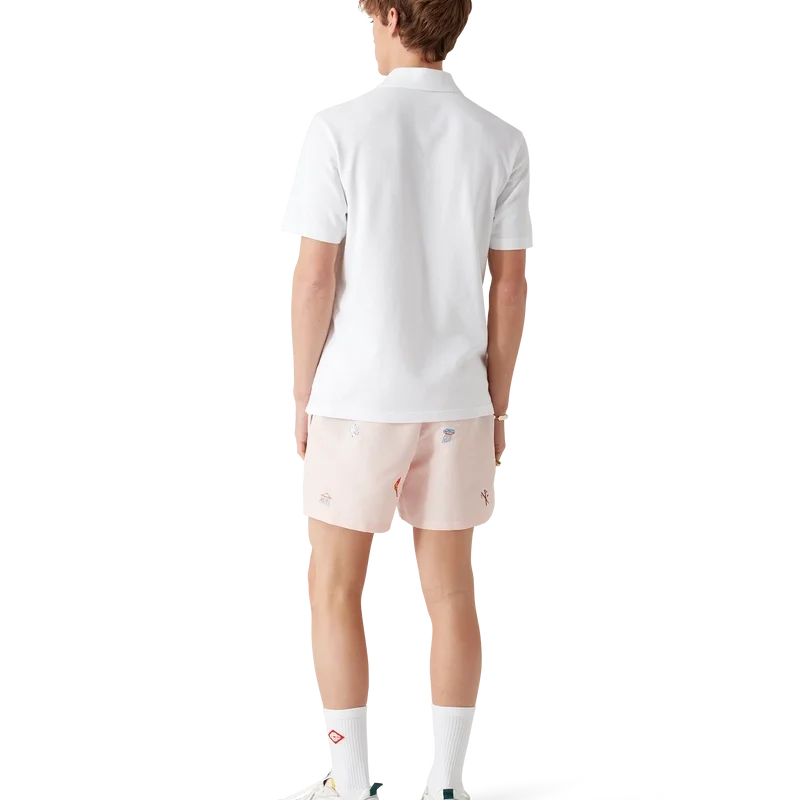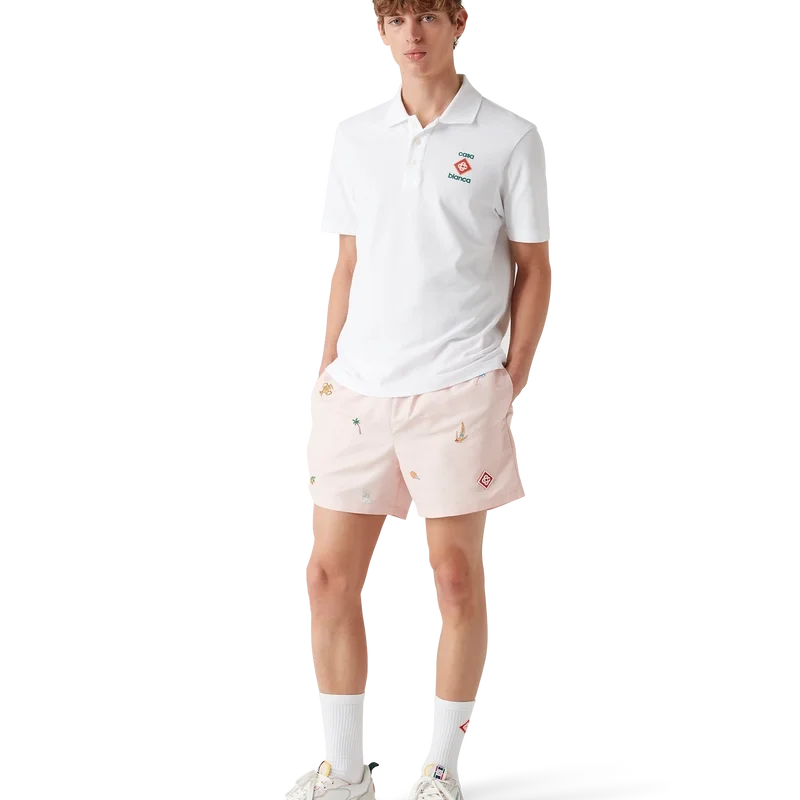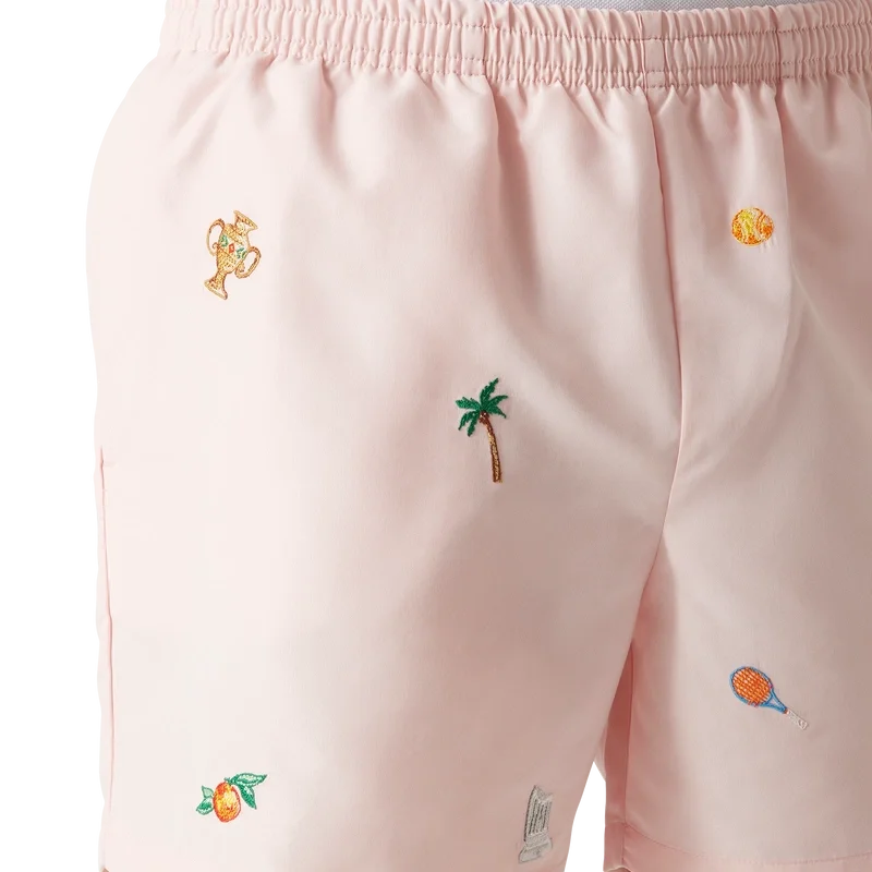 Los pantalones cortos con motivos bordados presentan un diseño clásico confeccionado en tejido de poliéster ligero con motivos bordados que representan la simbología de la casa en relación con la naturaleza, el tenis y la arquitectura. Cuentan con cintura elástica, cordón de ajuste interior, bolsillos laterales en las costuras, forro de malla elástica, bolsillo interior y el emblemático logotipo de silicona en forma de diamante.