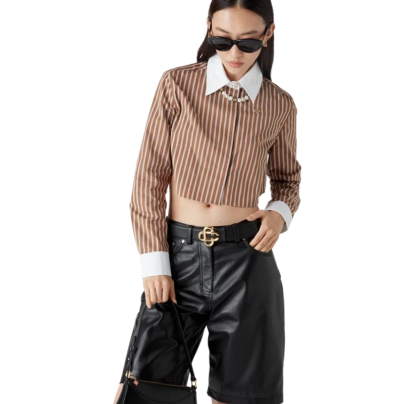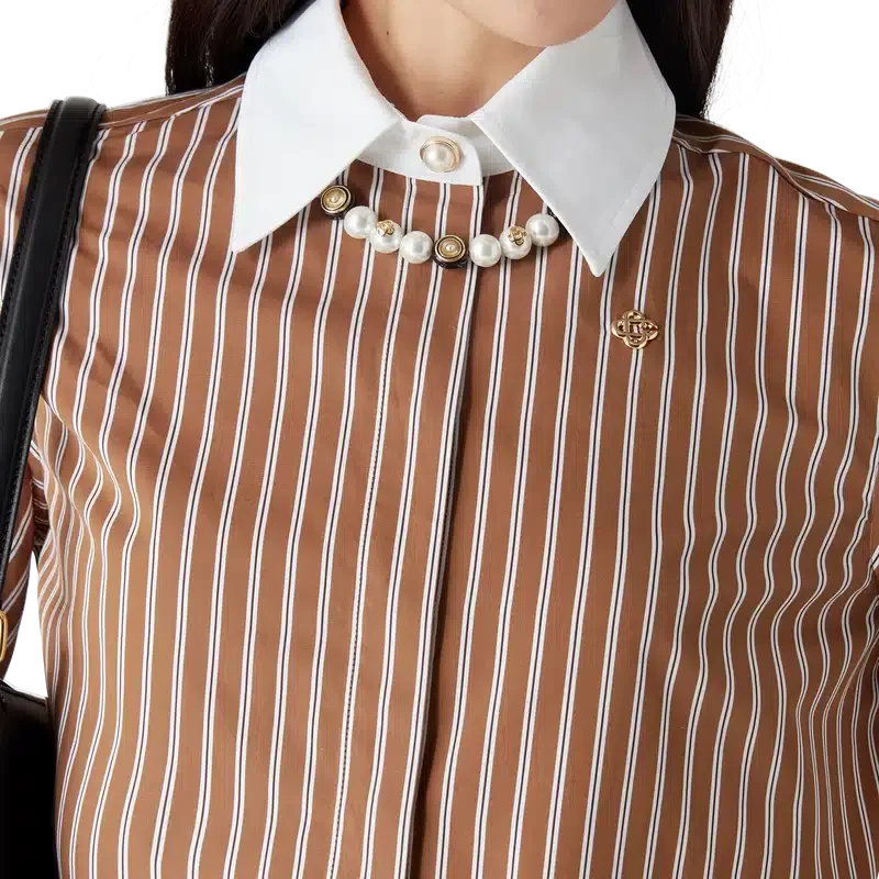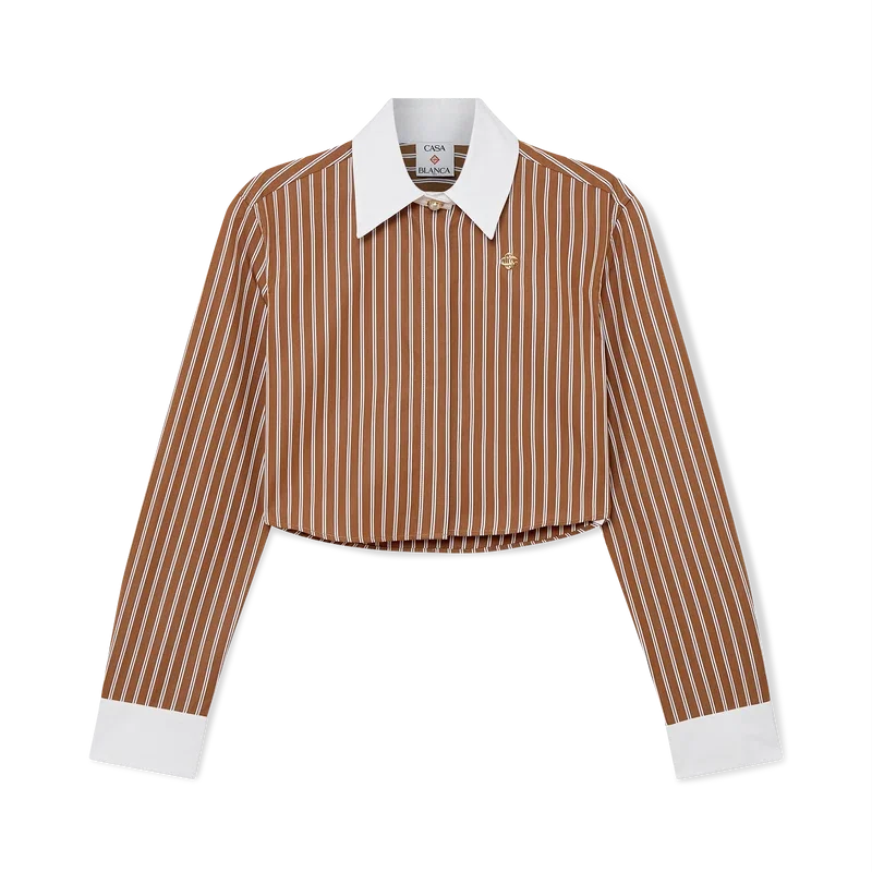 La camisa corta de manga larga a rayas es un modelo corto confeccionado en tejido de algodón Barra. Cuenta con cierre de botones, botones de corozo con el logotipo de CC entrelazado, el característico botón de perla con borde dorado en el cuello, cuello y puños en punta blancos a contraste y un dobladillo curvo.