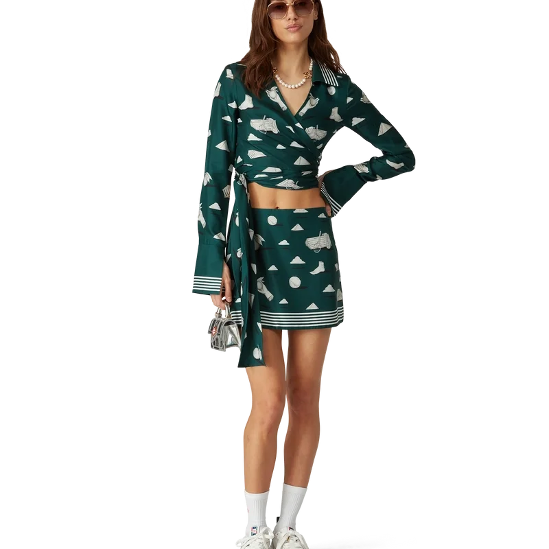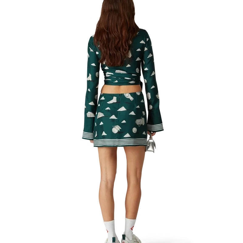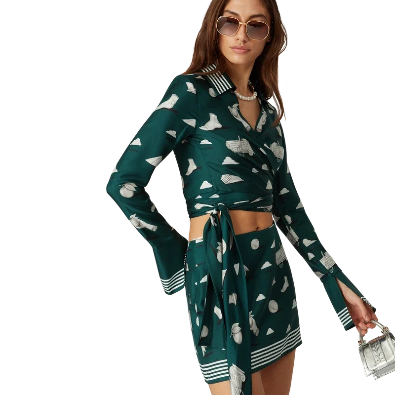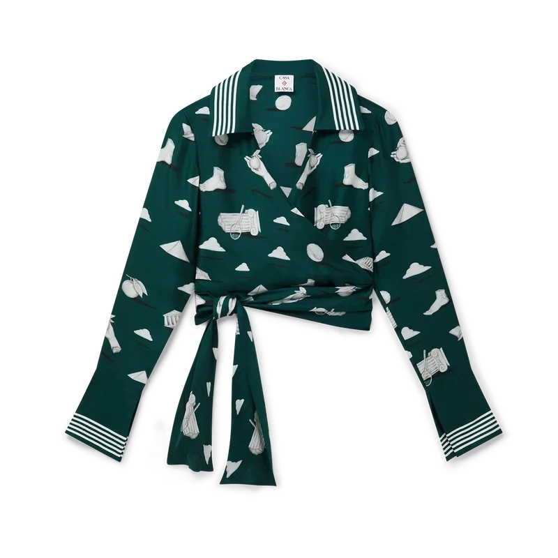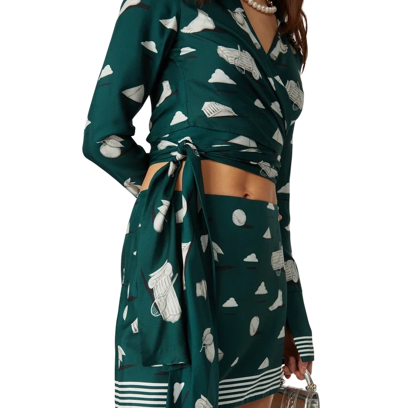 La camisa cruzada de seda Metaphysical es un diseño estampado integral de manga larga, confeccionada en tejido de sarga de seda, con un motivo repetitivo en trampantojo de efecto piedra y un ligero dibujo de los elementos centrales del diseño. Se completa con un cuello en pico y mangas acampanadas con abertura y detalle de ribete a rayas, y un cierre cruzado.