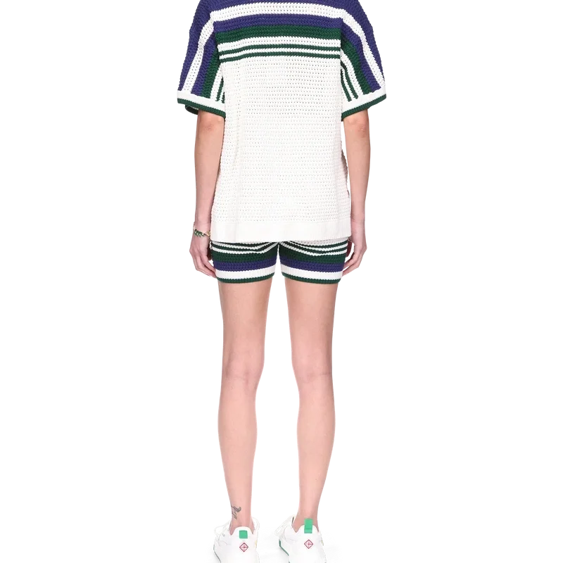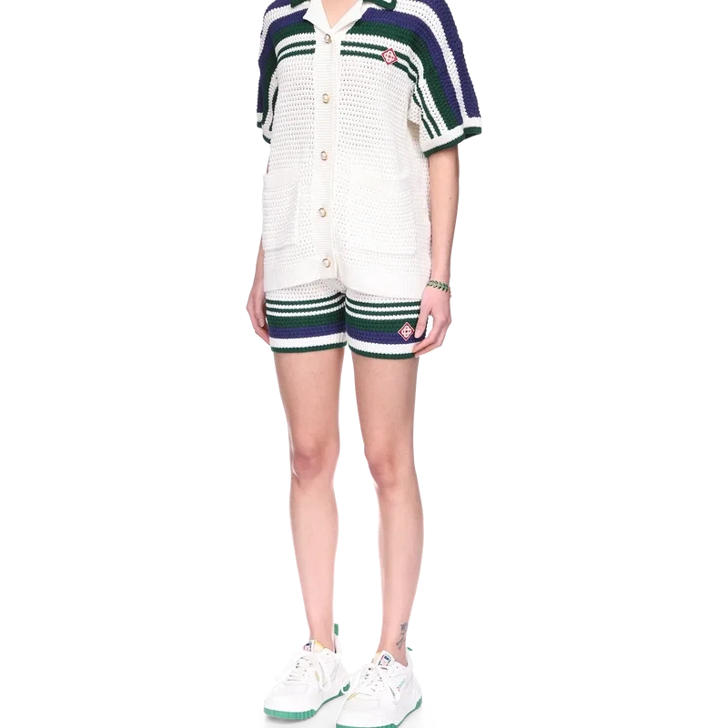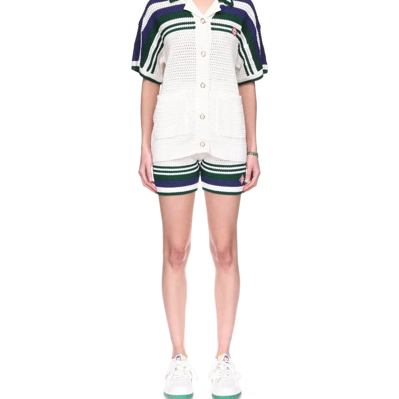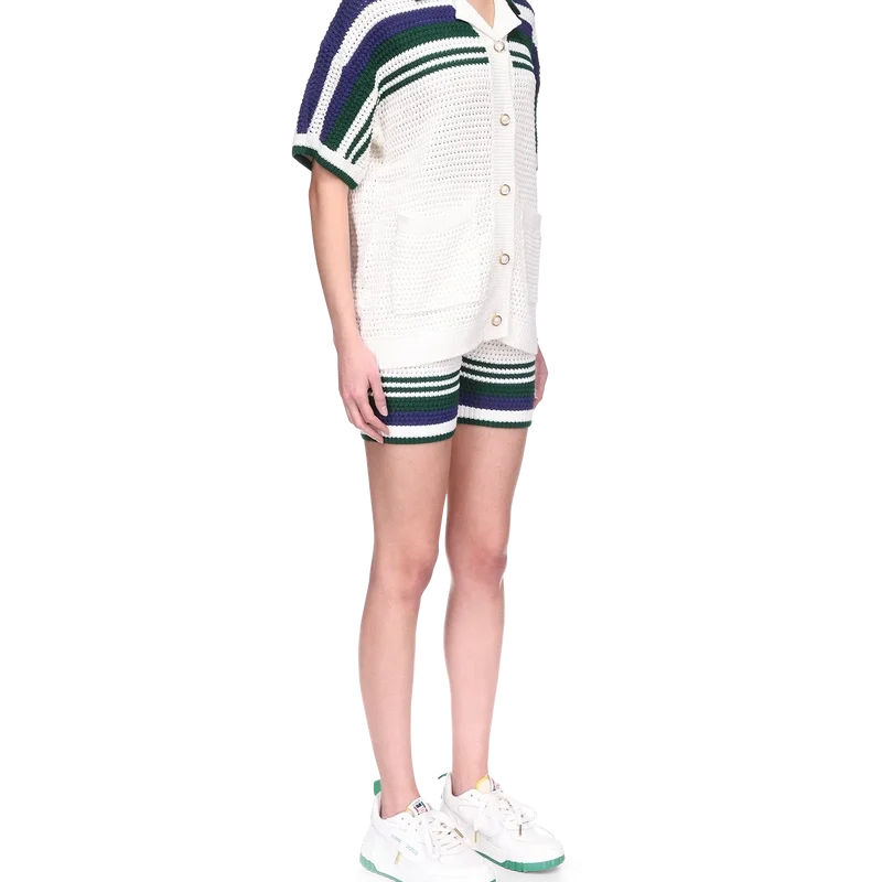La camisa de tenis de punto de ganchillo para mujer es un diseño de algodón tejido que presenta el emblemático logotipo de diamante entrelazado de la casa. Acabada con ribetes en contraste en el cuello y los puños acanalados, cierre con botones, detalle de rayas en el pecho, los hombros y las mangas, botones de perla con borde dorado característicos y bolsillos de parche en la parte delantera.