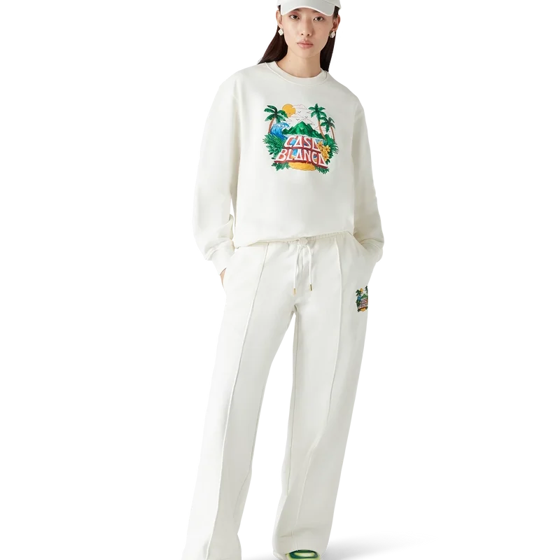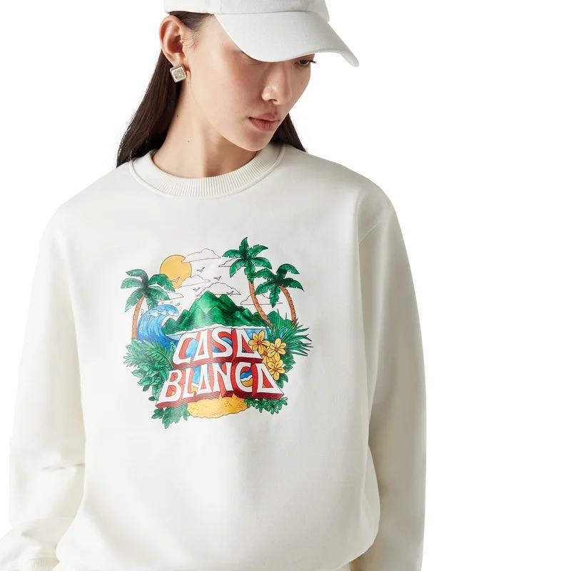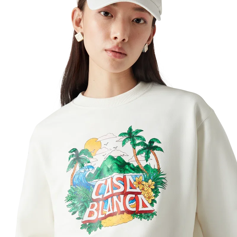 La sudadera Casa Beach Wave es un diseño estampado de manga larga confeccionado en tejido de algodón orgánico y presenta un diseño característico que recuerda a las camisetas de recuerdo que se compran en las vacaciones en la playa. Cuenta con un cuello redondo clásico.
