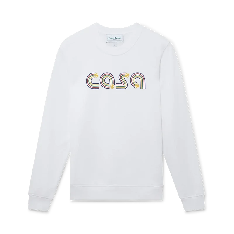 Sudadera de algodón orgánico con estampado serigrafiado para mujer de la línea Casa. Presenta el diseño característico de la casa reinterpretado para la cápsula exclusiva de Nordstrom, centrada en el estilo «athleisure» moderno inspirado en el tenis. Con cuello redondo clásico, mangas largas y etiqueta con la marca Casablanca Paris, diseñada para un corte holgado.